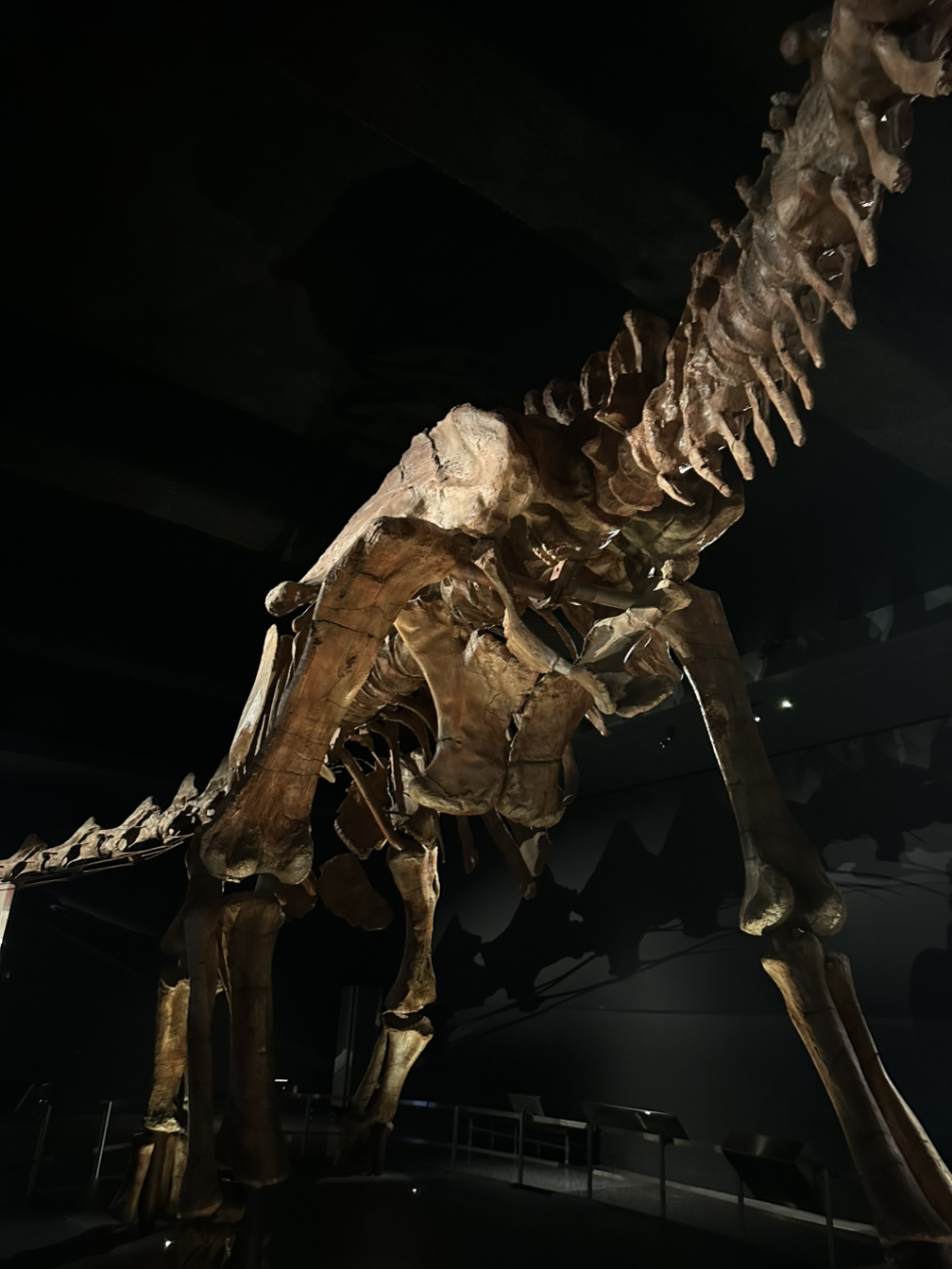앞에서 우와 우와 하면서 공룡 화석을 보다가 마주한 정말 거대한 공룡 화석... 이 화석에 비하면 앞에서 본 화석들은 미니미에 불과했다... 이 공룡은 티타노사우르스라고 한다. 4층 높이의 길이이고 코끼리 10마리의 무게라고.. 위로도 길고 앞뒤로도 너무 길어서 머리와 꼬리가 전시장을 삐져나가고 있었다. 이렇게 놀라운 화석을 발견하다니 담당자는 얼마나 기분이 좋았을까 생각한다.
