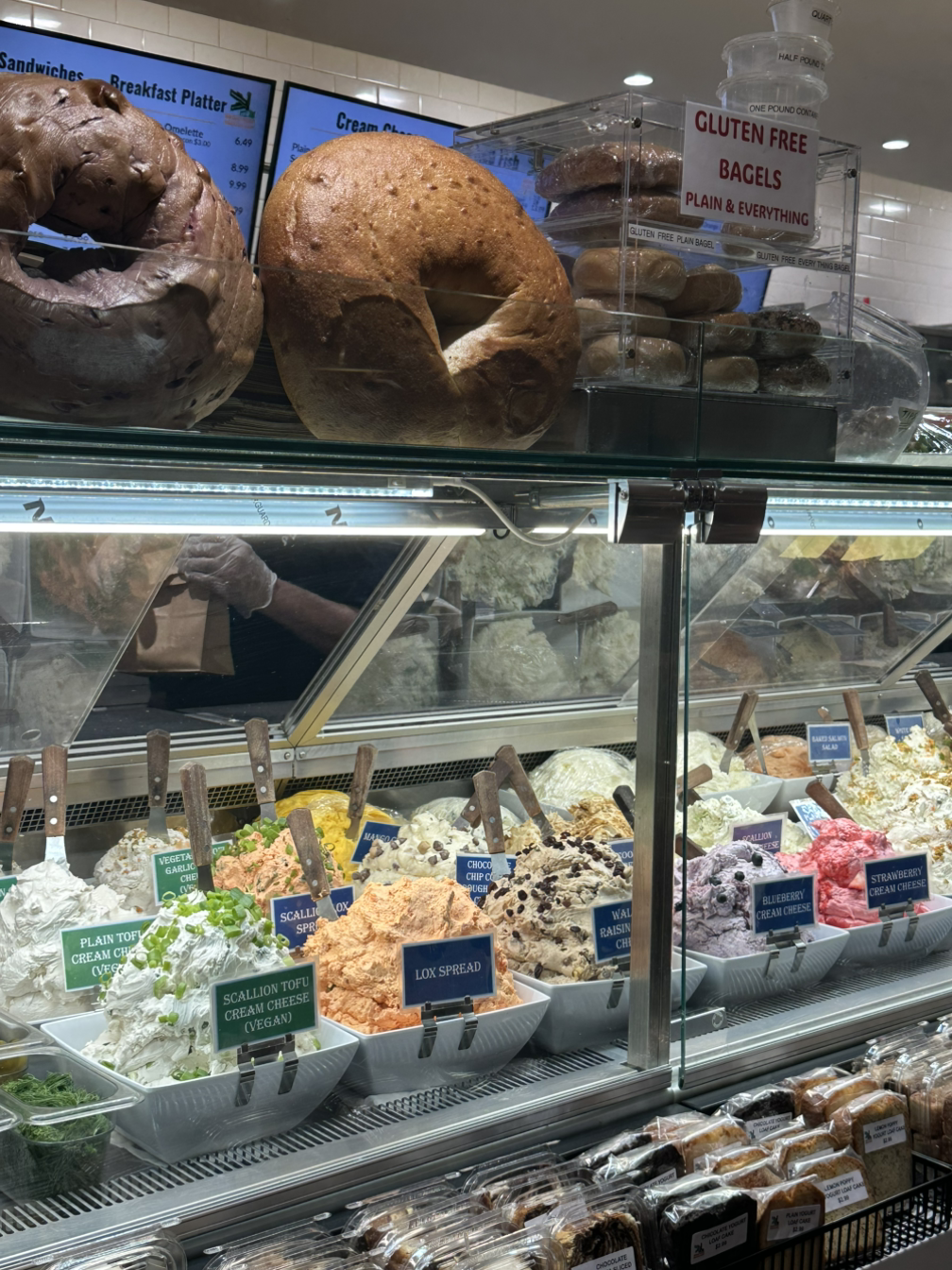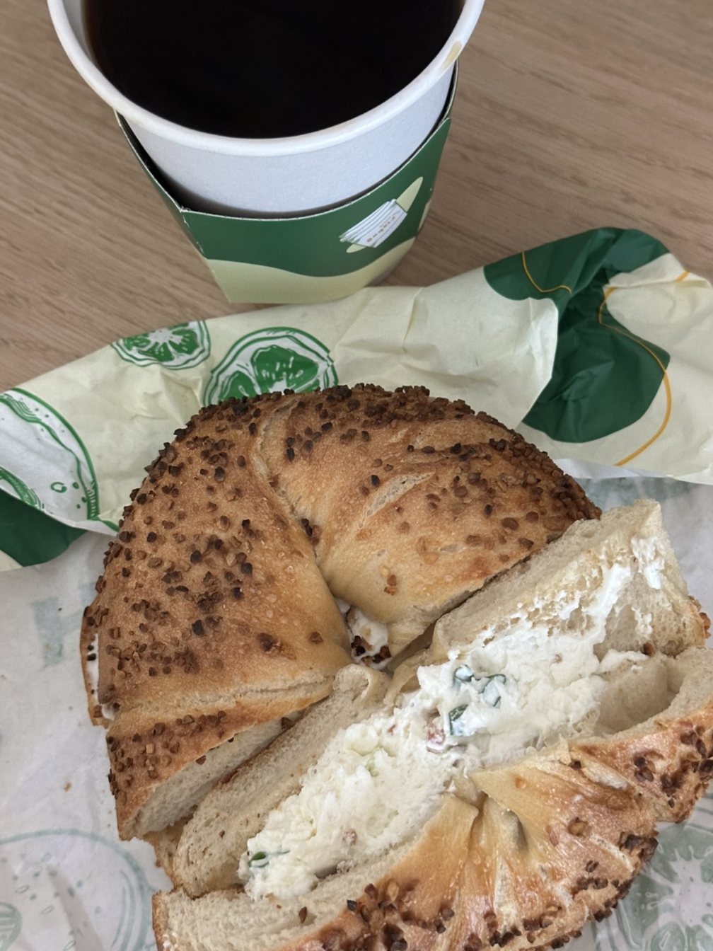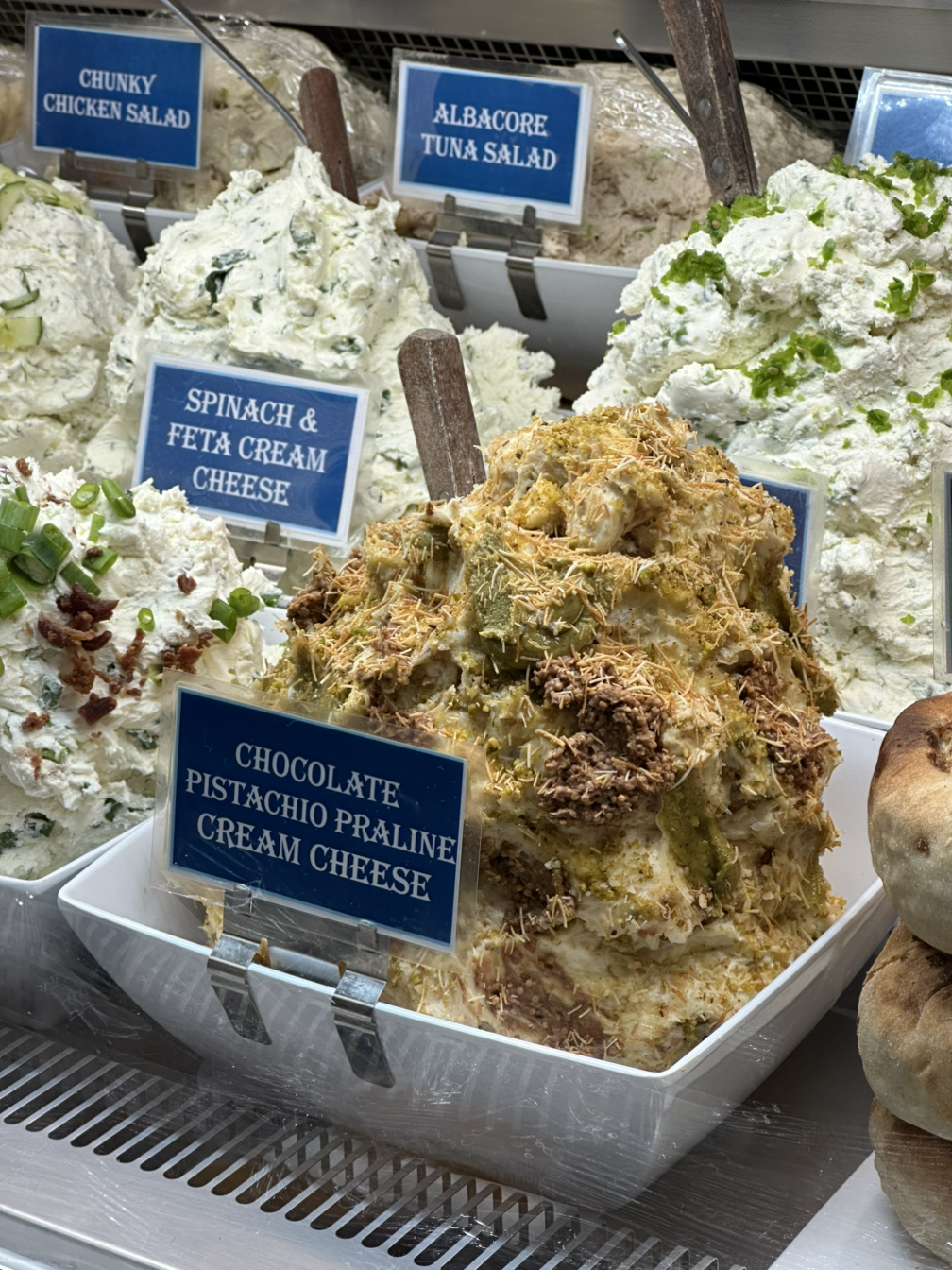 오늘 아침도 베이글로 시작! 다이너에 가는 날이었지만 이제 슬슬 귀찮아져서 그냥 숙소 근처 새로운 베이글 집에 갔다. 오늘도 심플한 조합으로 도전! 어니언 베이글 + 베이컨 스칼리온 크림치즈 조합으로 먹었다. 줄서서 기다리던 중에 발견한 초콜렛 피스타치오 프랄린 크림치즈..!? 도대체 무슨 맛일까 궁금하다. 프랄린하니까 생각나는 나의 빵 프로젝트, 잘 되고 있을지 걱정된다.
