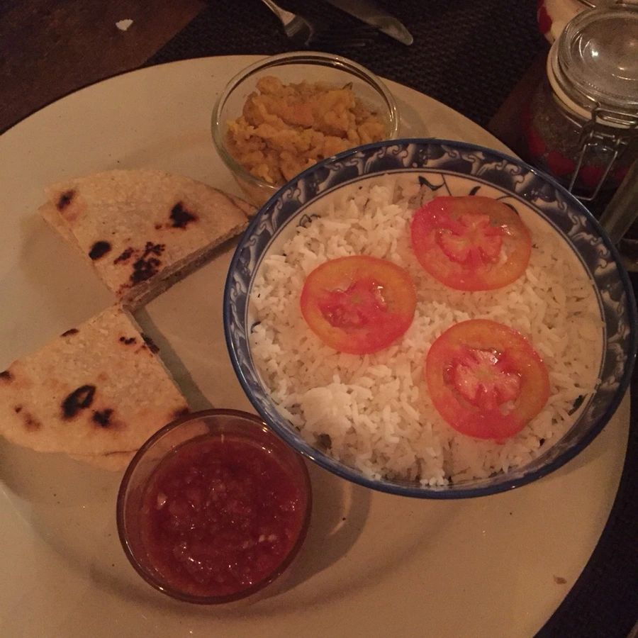 미리사에서 저녁을 먹으려고 하다가 괜찮은 식당을 찾지 못해서 웰리가마에 있는 곳에 갔다. 이 곳도 자연의 오두막을 닮은 식당이었다. 특이한 점은 맨발로 2층에 올라가야 식사하는 공간이 나온다는 점이었다. 여기서는 새로운 메뉴에 도전해보고 싶어서 ‘실론 핫 볼’이라는 걸 시켜봤다. 이 곳도 느림의 미학이 있는 곳인 듯 매우 느리게 나왔다. 이 곳의 음료는 큰 유리 보틀에 담겨서 나왔는데 과일주스가 굉장히 맛있었다. 실론 핫볼은 토마토가 얹어진 흰 쌀밥과 후무스 같은 질감의 달 커리, 칠리 토마토 소스 같은 거, 그리고 두꺼운 난 같은 것으로 구성되어 있었다. 굉장히 건강한 맛이었다.