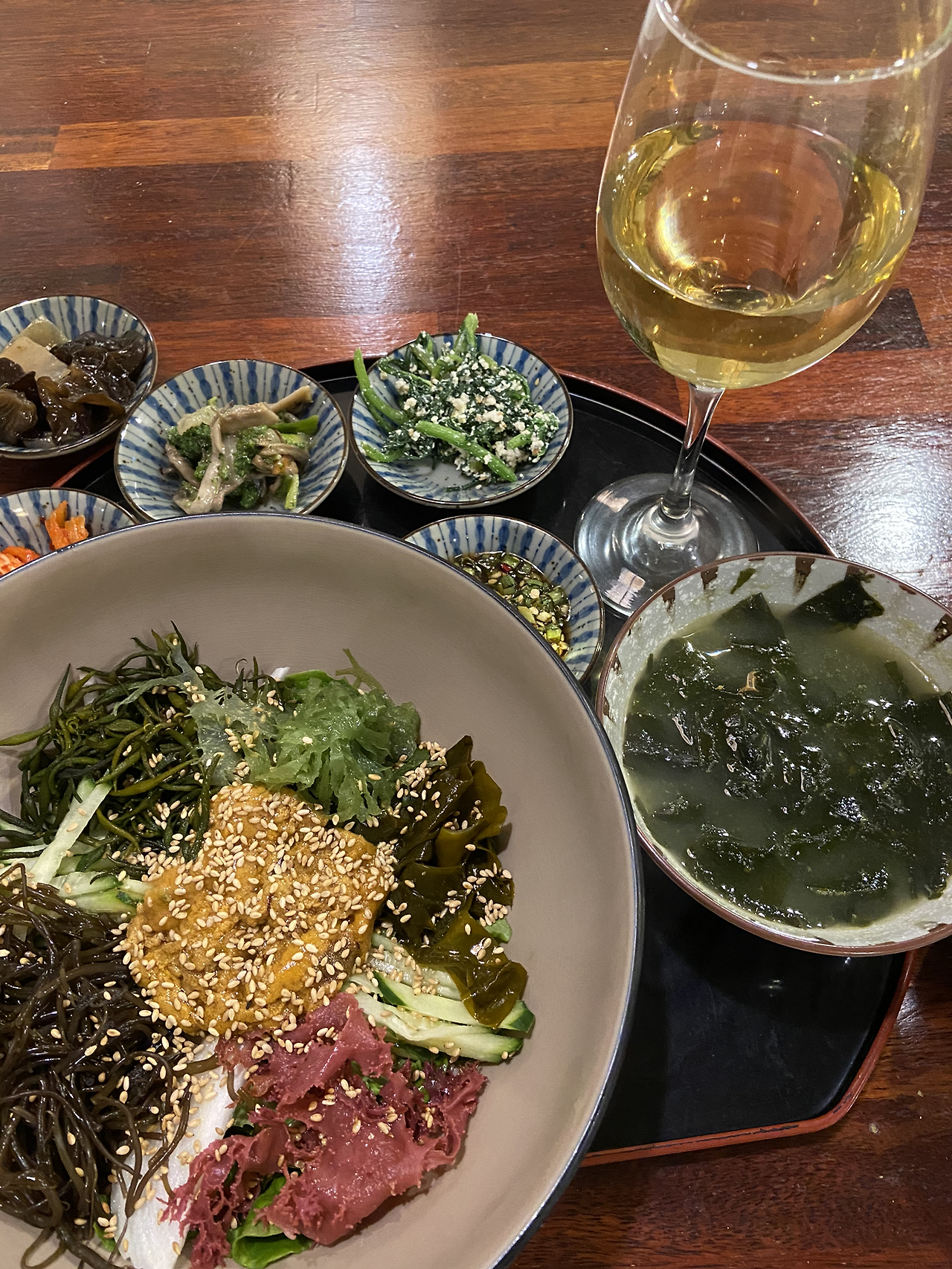 이곳의 음식은 주기적으로 바뀌는 것 같은데, 첫해에 먹었던 한치물회, 둘째 해에 먹었던 장어탕도 맛있었지만 올해 가서 먹은 해초성게빔밥이 정말 최고였다! 평소 채소가 들어간 비빔밥은 먹어봤어도, 해초가 주인공인 비빔밥은 처음이었다. 제주의 정체성과 잘 맞게, 해녀들이 직접 따온 해초들과 맛있는 양념이 버무려져 있어 바다의 느낌을 물씬 받을 수 있었다. 정말 좋은 점은 1인을 위한 글라스 와인을 판매한다는 점! 바다 구경하고, 요가와 명상 클래스로 몸과 마음을 가볍게 한 다음 늦은 저녁으로 해초 비빔밥과 와인 한 잔 하고 숙소로 들어가면 완벽한 하루 일정이 완성된다.