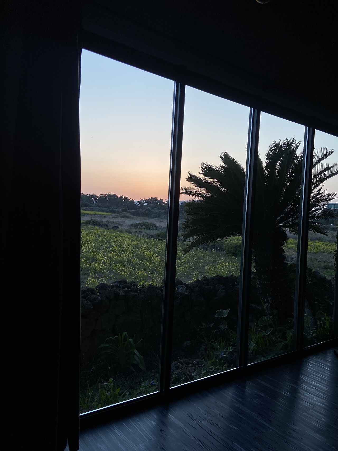 큰 유리 통창을 통해 제주의 자연이 보이고, 저녁시간대에 가면 서서히 지는 노을을 보며 수련할 수 있다. 객실에서 크게 이동할 필요 없이, 바로 지하 1층으로 내려가면 요가 수련할 수 있는 공간이 나와서 정말 편리하다. 들어갈 때 나는 은은한 인센스향과 고요한 요가의 음악들, 하얗고 아름다운 다기들이 벌써부터 마음을 차분하게 만든다.