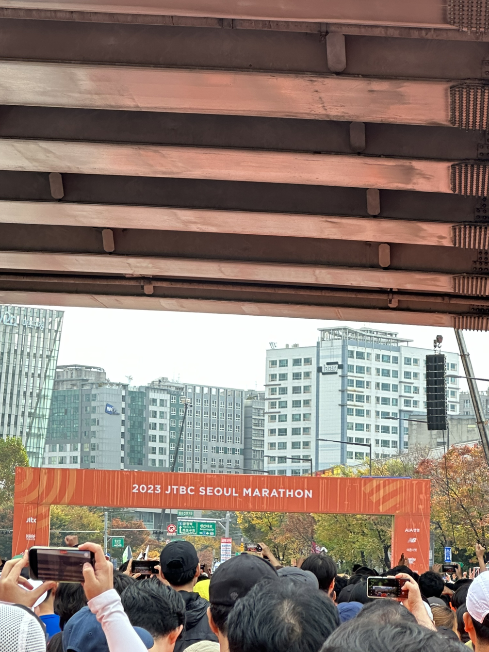 많은 사람들과 함께 출발선에 대기하다가 드디어 출발선 너머로 한 발짝을 내디뎠다. 원래 나의 러닝 라이프에 대해 말해보자면, 최고로 많이 달려본 게 7k 정도고 그 마저도 걷다가 뛰다가를 반복하는 사람이었다. 1k만 가도 숨차고 힘든 느낌이 들어 바로 걸어버리는 사람이었다. 그런데 이번에는 달랐다. 내 주변엔 온통 주황색 옷을 입은 러너들로 가득 차 있고 그들 모두 걷지 않고 뛰고 있으니, 나도 멈출 수 없었다. 마라톤에 나가면 소위 '대회 빨'이라는 게 있어서 평소보다 더 잘 뛰게 된다는 이야기를 들었는데 정말이었다. 군중심리인지, 동기부여일지 모를 그 이상하게 벅차오르는 마음을 안고 나도 함께 뛰었다.