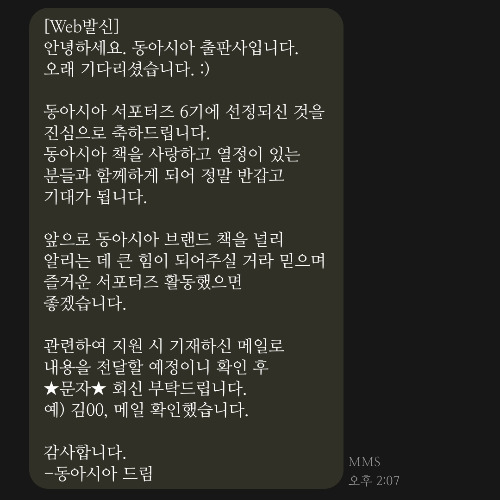 동아시아 출판사에서 보낸 서포터즈 선정 문자였기 때문이다...