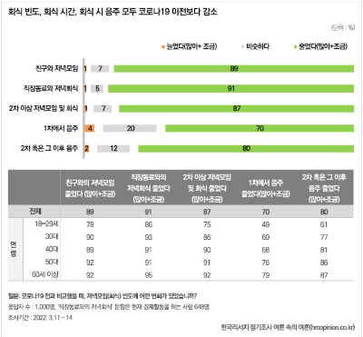이제는 제법 시간이 흘렀지만, 팬데믹 이전의 사회는 지금보다 훨씬 북적거렸던 기억이 분명합니다. 회식도 잦았고, 각종 모임도 많았습니다. 사람과 사람 사이의 접촉은 지금보다 훨씬 빈번했죠. 이것은 기억만이 아니라 자료로도 확인됩니다. 한국리서치의 조사에 따르면, 팬데믹 발생 이후 개인적 모임과 회식이 모두 줄어든 것으로 나타났습니다.