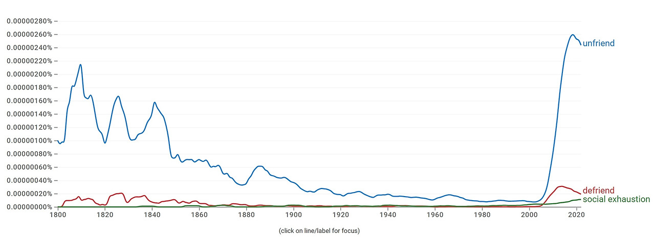 사람들은 이미 팬데믹 이전부터 인간관계에 피로를 느끼고, 관계를 정리하고 싶어 했습니다. ‘사회적 탈진’이나 ‘인간관계 정리’ 같은 단어가 점차 대중화된 것은 이를 뒷받침합니다. 구글 엔그램뷰어를 보면, 이러한 단어들의 사용 빈도가 이미 팬데믹 이전부터 상승하고 있었죠. 만나지 않아도 되는 사람을 굳이 만나지 않게 된 덕분에, 오히려 인간관계에 대한 관심이 일시적으로 줄어든 것도 자연스러운 일입니다.