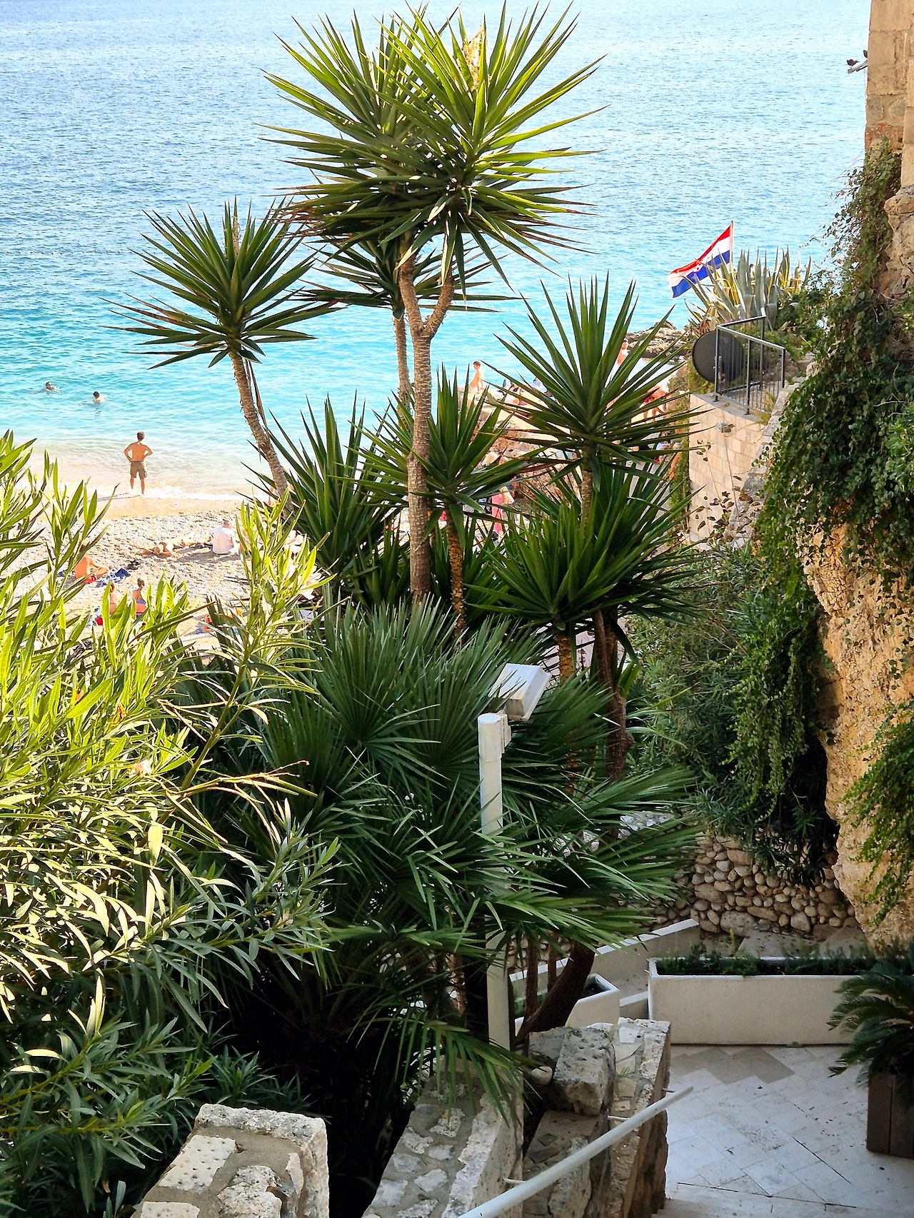 얼마 지나지 않아 아래쪽으로 파랗게 펼쳐진 해변이 보였다. 몇 개단을 서둘러 내려가니 주황색 지붕의 집들이 병풍처럼 펼쳐지면서 작은 해변을 포옥 감싸고 있었다. '우와~~~' 고대 도심을 지나 펼쳐지는 아드리아해는 색다른 매력이었다. 생각보다 해변의 길이가 짧아 당황스럽긴 했지만, 아담하고 고요한 분위기 속에서 자유를 즐기는 사람들의 모습과 한가롭게 일광욕을 즐기는 사람들의 모습이 어우러져 동해나 제주 바다와는 확연히 다른 특별한 매력이 분명 있었다.