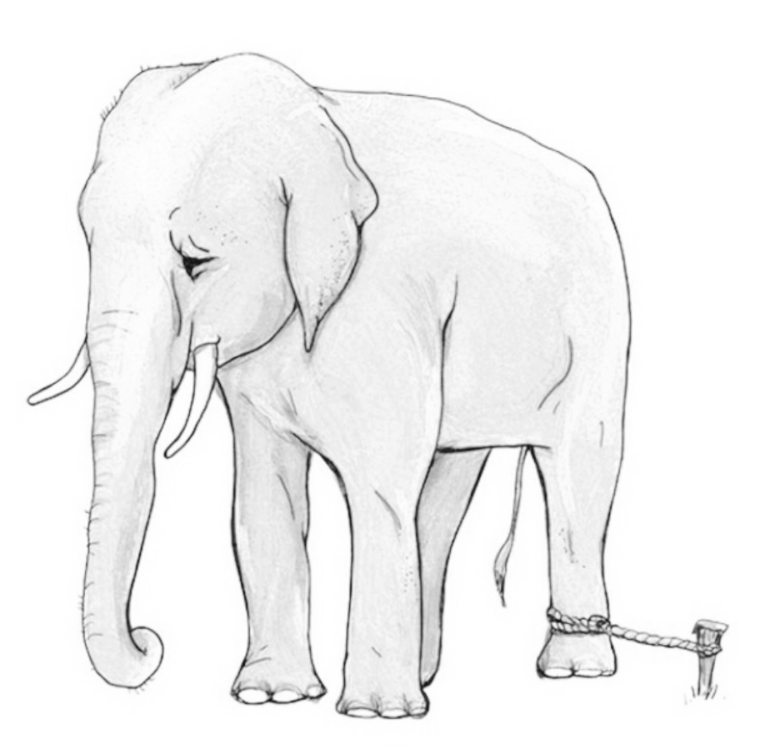 어릴 때부터 쇠사슬에 묶여있던 코끼리는 커서 몸집이 5t 이상 나가고 쇠사슬을 끊고도 남을 만큼의 충분한 힘이 생겼음에도 불구하고 묶여있던 쇠사슬을 벗어나려 하지 않는다. 스스로를 한계 지어 충분한 능력이 있음에도 할 수 없다고 생각하는 것이다.