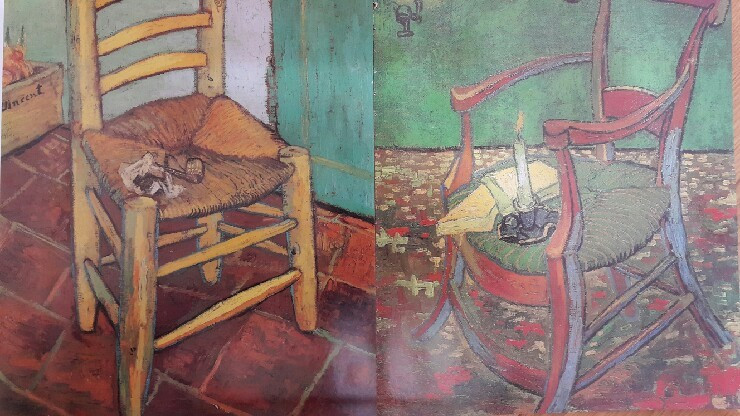 저는 비슷한 예를 고흐의 의자에서 발견했는데요. 고흐가 그린 자신의 의자와 고갱의 의자를 비교해보면 그의 자의식을 확인해 볼 수 있습니다. 왼쪽의 수수하고 파이프가 놓여진 의자는 고흐의 것이고 화려한 붉은 빛의 초가 놓인 의자는 고갱의 의자입니다. 고흐가 바라본 자신과 고갱의 모습을 비교할 수 있습니다.