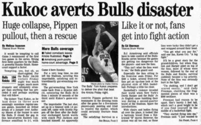 홈에서 시카고는 3차전 3쿼터 종료 시점에서 19점차로 리드하며 손쉽게 승리하는 듯 했다. 하지만 닉스의 막판 추격과 불스의 슈팅 난조로 경기는 종료 1.8초 남기고 동점 상황이었다.