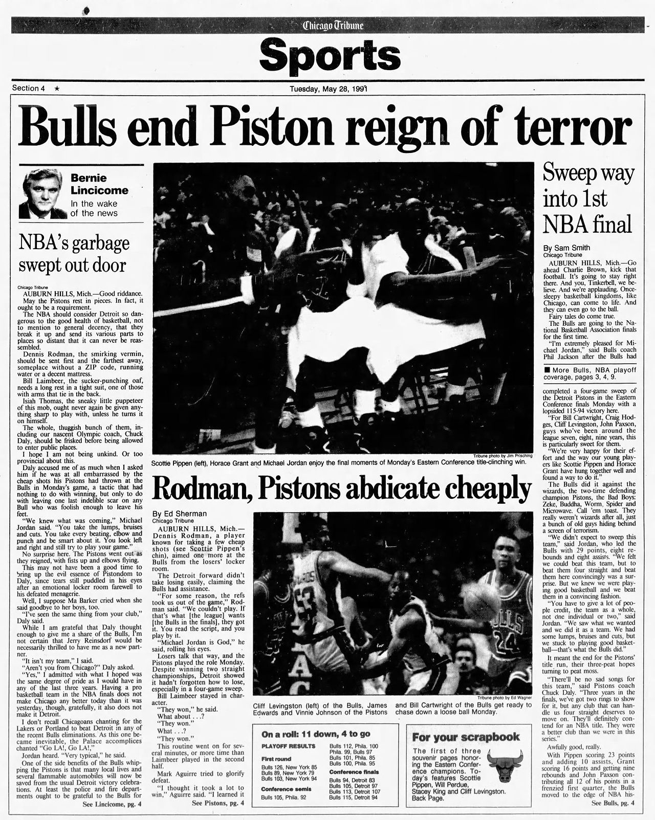 '88 플레이오프 1라운드에서 워싱턴 불리츠를 꺾은 배드 보이즈는 2라운드에서 87~88 정규시즌 MVP & 득점왕 & 올해의 수비수에 빛나는 '새로운 신성' 마이클 조던이 이끄는 시카고 불스를 만나게 된다. 디트로이트에서 치러진 1차전은 배드 보이즈가 11점 차로 여유롭게 승리하였으나, 2차전에서는 36 득점을 기록하며 맹활약을 펼친 조던을 봉쇄하는데 실패하며 충격적인 홈 패를 당한다.