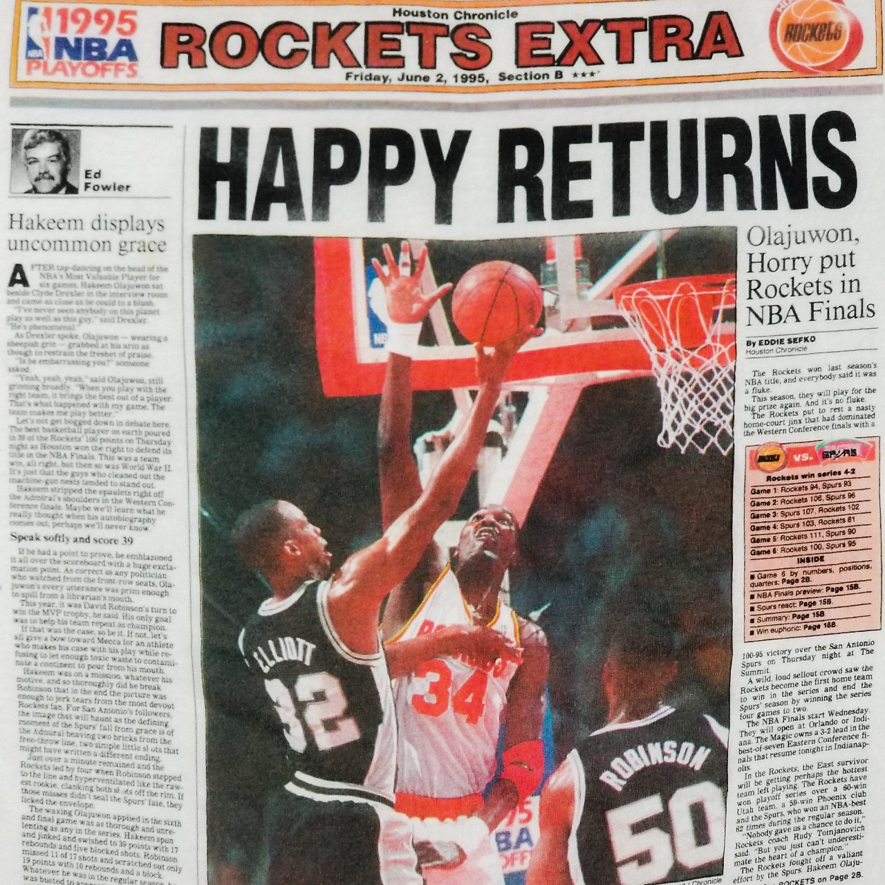1차전 스미스의 NBA 신기록. 2차전 샘 카셀의 벤치 31득점 맹활약. 3차전 로버트 호리의 빅 타임 쐐기 3점. 4차전 하킴 올라주원의 우승을 신고하는 3점. 매 경기마다 새로운 히어로를 탄생시킨 휴스턴 로케츠는, 노련미를 바탕으로 젊은 에너지로 가득 찬 매직을 박살내고 백 투 백 챔피언십 트로피를 들어 올린다.