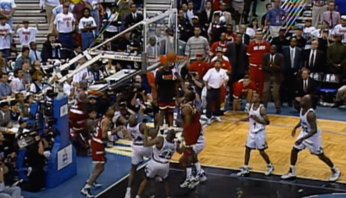 연장전에 돌입한 1차전. 연장전 막판까지 박빙 승부 양상을 띄며 118 : 118 동점 상황. 마지막 포제션에서 클라이드 드렉슬러가 오른쪽 페네트레이션에 이은 핑거롤을 미스하지만, 휴스턴은 튕겨 나온 리바운드를 마치 배구공처럼 팁 인 시켜버린 하킴 올라주원의 '갸우뚱' 바스켓 덕분에 극적인 2점 차 승리를 거두게 된다.