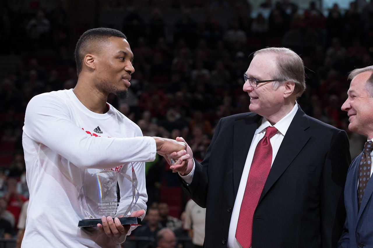 데미안 릴라드에게 '이달의 선수' 트로피를 전달하는 폴 앨런 전 구단주 (출처 : NBA.COM)