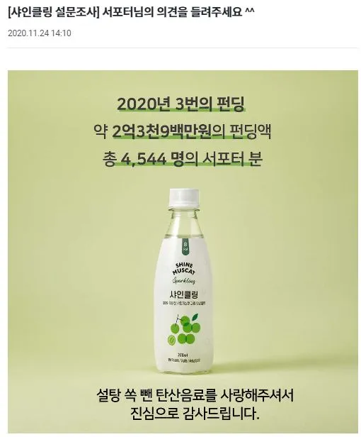 물론 성과도 좋았지만, 펀딩을 진행하면서 고객의 니즈를 파악한 점이 참 좋았어요. 저희는 제품 기획 초기에 20~30대 다이어터, 식단 관리 중인 사람들을 타깃으로 기획을 했었는데요. 서포터님들은 가족 단위로, 물처럼 마시는 분들이 많더라고요. 그래서 저희 주 고객층을 알 수 있게 되었어요. 또, 와디즈 펀딩을 통해서 정말 강력한 팬덤이 형성되었다고 생각해요. 샤인클링 새소식에 피치클링 펀딩 오픈 예정이 시작되었다는 새소식을 올리자마자 첫날에 알림 신청자가 500명이 넘었을 때 와디즈 내에 있는 저희 팬덤의 힘을 느꼈어요.