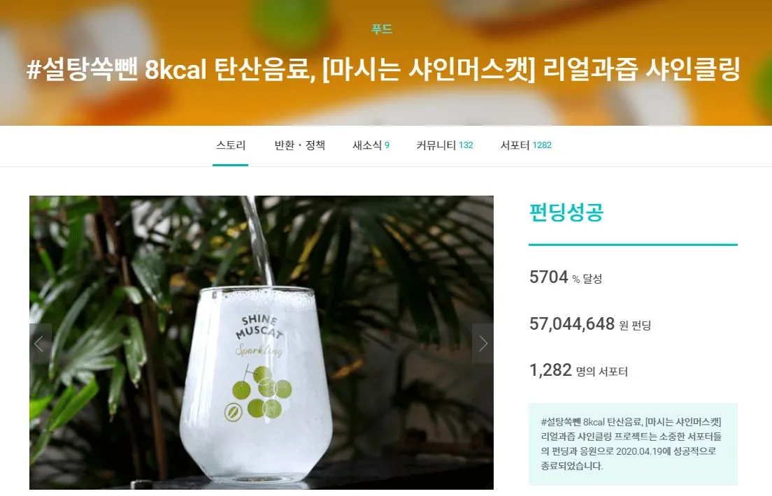 저는 아까 말씀드린 것처럼 목표 금액을 1000만 원, 좀 더 희망적으로 2000만 원 정도를 보고 생각을 했어요. 와디즈에 탄산음료를 검색했을 때 최대 펀딩액이 천만 원 정도였거든요. 그런데 PD님이 봤을 때는 이건 3,000만 원 이상도 할 수 있는 제품이다. 목표 달성 수치를 높이자라고 방향 설정을 해주셨고, 목표에 따라 광고, 펀딩 리워드 설계를 바꾸었습니다.