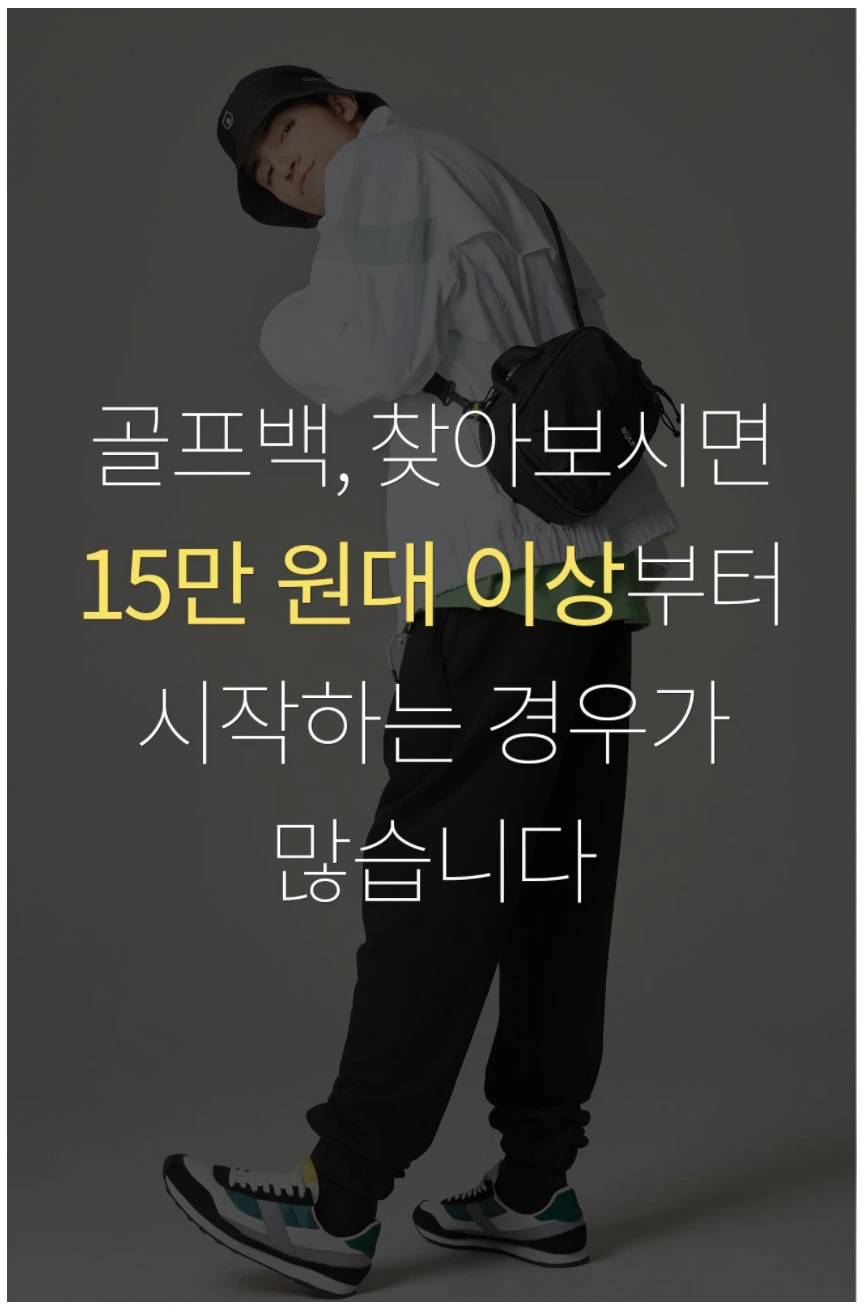 그래서 이 사진을 사용했습니다. 골프백이 99,000원인 것이 결코 비싼 느낌이 들지 않도록 정말 고가의 골프백이 많다는 걸 알리며 상대적으로 우리 제품이 합리적인 것처럼 보이는 효과를 노렸습니다.