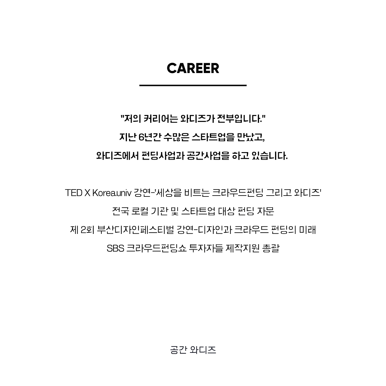 운이 좋게도 여러 과정을 통해 성장해왔고 이제는 그 이야기들을 함께 일하는 구성원들과 또 와디즈에 더 좋은 분들을 많이 모시기 위한(채용) 시간을 자주 가지려고 합니다. 그 첫 시간에 참석하고 싶은 분이 있다면 아래 내용을 확인해주세요.