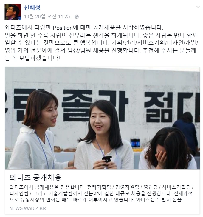내가 일하는 와디즈에서는 올해 4-5번의 채용을 공개/비공개 형태로 진행했던 것 같다. 그리고 지금의 와디즈 멤버가 꾸려졌다. 6-7명 멤버였던 시절이 불과 1년전이었는데, 어느새 25명 규모의 스타트업이 되었다. 그리고 지금도 좋은 사람을 '모시는' 노력은 지속되고 있다. 그런데 얼마전 쥐도새도 모르게(물론 누군가는 알고있었겠지만) 우리 회사의 채용소식이 대표님의 sns 타임라인에서 공개되었다.