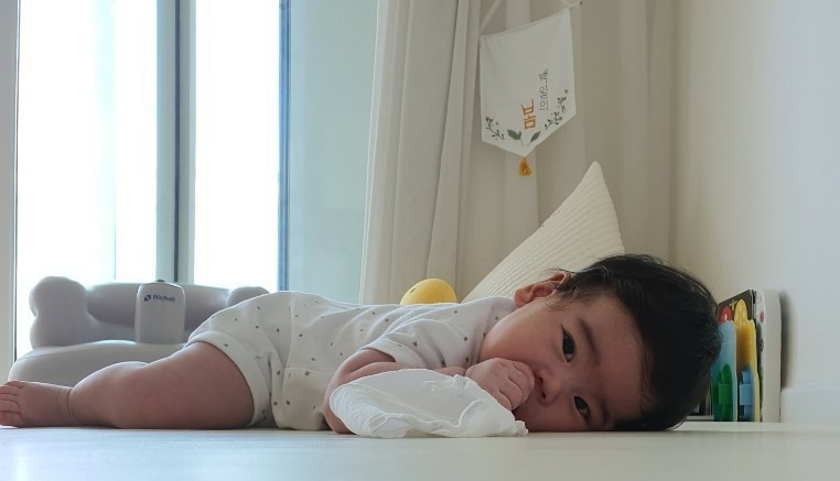 슬슬 뒤집을 때가 되지 않았나 싶어, 엉덩이를 밀어보기도 하고 심지어 옆에 누워서 뒤집는 시범을 보여주기까지 했지만 별 관심이 없다. 머리칼이 많이 자라 눈을 찌르는 것 같은데 곱슬머리가 베베꼬여 있는 것이 너무 귀여워서 자를 엄두가 나지 않는다. 의자에 앉혀 보지만 고개를 꼿꼿히 세우기는 아직 무리다. 엄마가 외출해도 울진 않는다. 그게 고맙다.