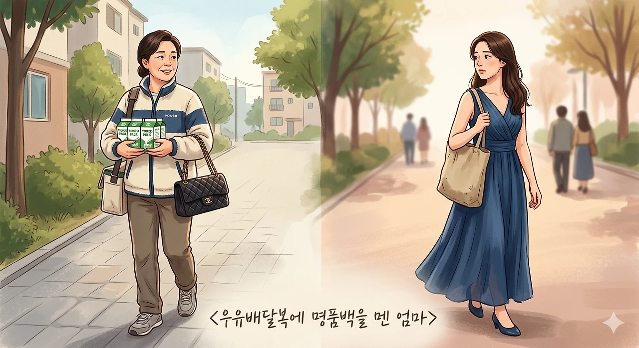 우유 배달 복장에 명품백을 멘 엄마나