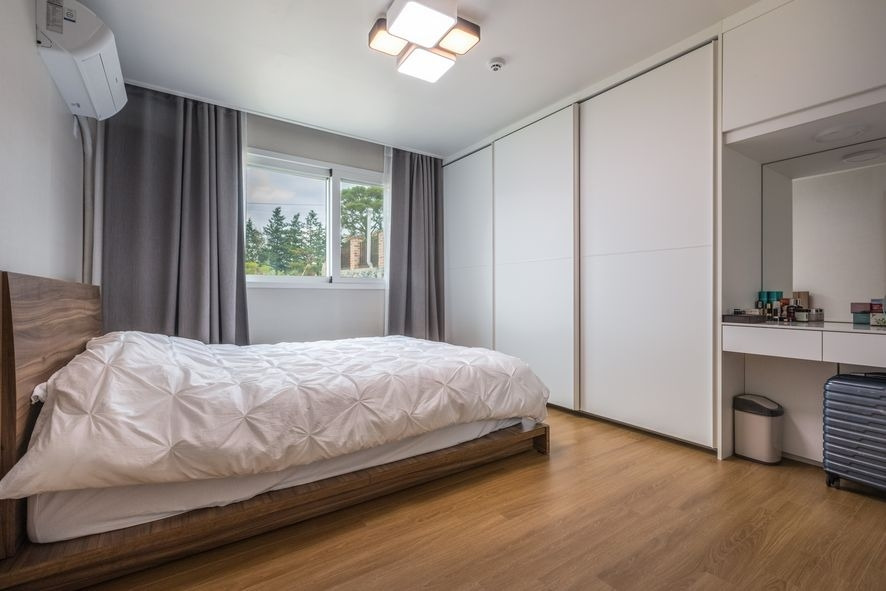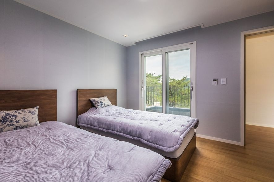 개인 공간인 침실은 벽지 컬러를 침실을 사용하는 분들의 취향이 담겨져 있다고 볼 수 있는데요, 어떠한 가구도 잘 어울리는 라이트그레이, 또 하나의 침실은 마음이 편안한 라벤터 컬러를 사용하였는데요, 이 침실은 테라스와 연결되는 형태로 개인 공간과 외보와의 소통이 잘 이루어 질 수 있도록 시공하였답니다.