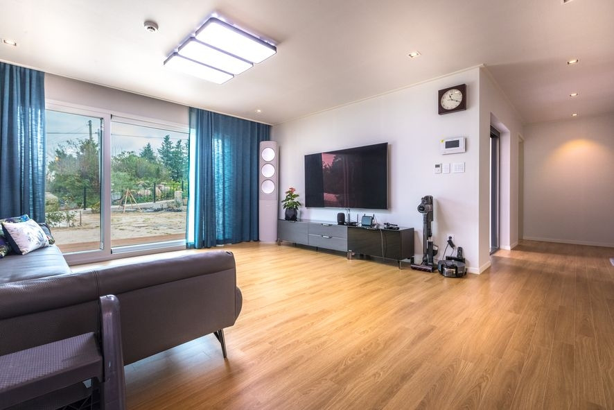 이제 코끝까지 차가운 겨울이 다가왔습니다. 하지만 이 주택의 거실은 따스함이 느껴지는데요, 넓은 창호와 가로형 창호를 통해서 따스한 햇살이 스며드는 것 같습니다.