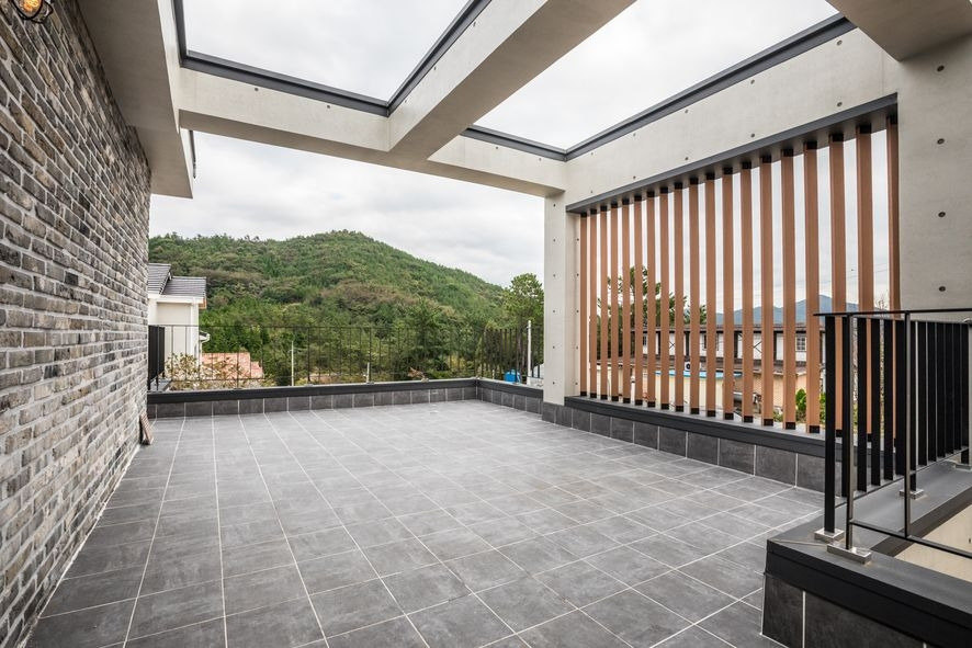 2층에 있는 테라스는 굉장히 넓은 공간이면서 노출콘크리트, 파벽돌, 목재루바를 한 곳에서 볼 수 있는 공간이지요. 다양한 벽의 형태 덕분에 더욱 특별함이 보여집니다. 더불어 천정 부분은 하늘을 바라볼 수 있는 투명 유리로 시공되었다는 점에서 하늘과 더 가까운 테라스, 특별한 테라스라고 볼 수 있겠습니다.