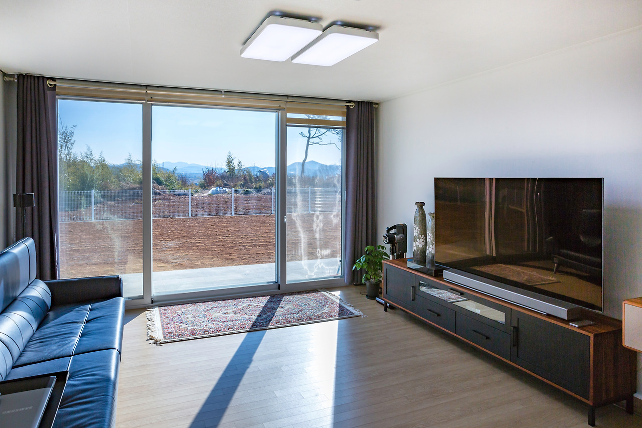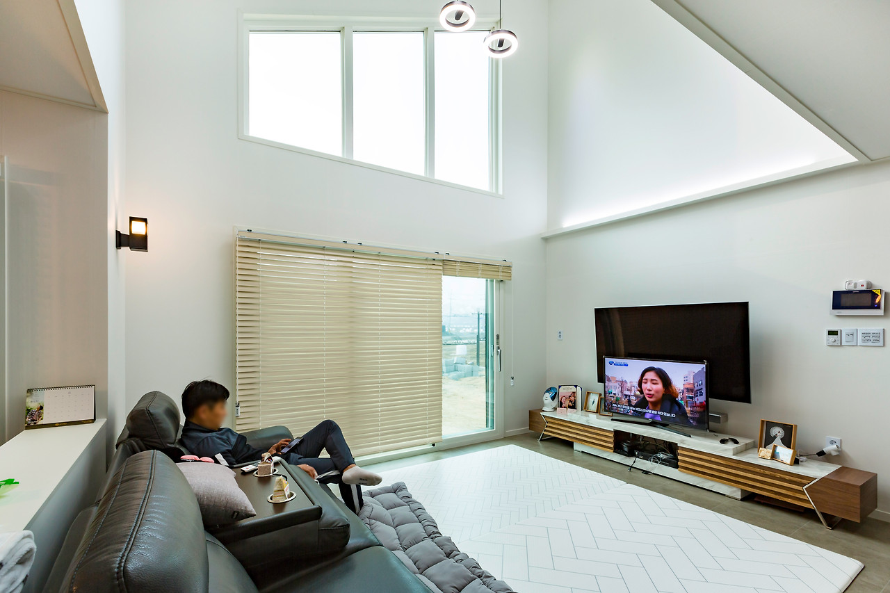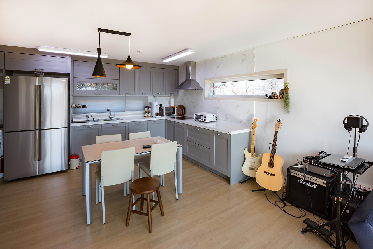 악기연주가 취미인 건축주님. 아파트 생활을 하게 된다면 이웃들에게 피해가 갈 수 있어 하지 못 했던 악기 연주를 현재는 마음껏 즐길 수 있게 되었습니다. 1층 거실, 주발 공간은 동선이 짧게 설계/시공하였으며 앞 마당과 바로 연결될 수 있는 큰 창호가 있어 외부 활동을 할 수 있습니다. 또한, 해당 창호 덕분에 채광이 좋을 것 같습니다.