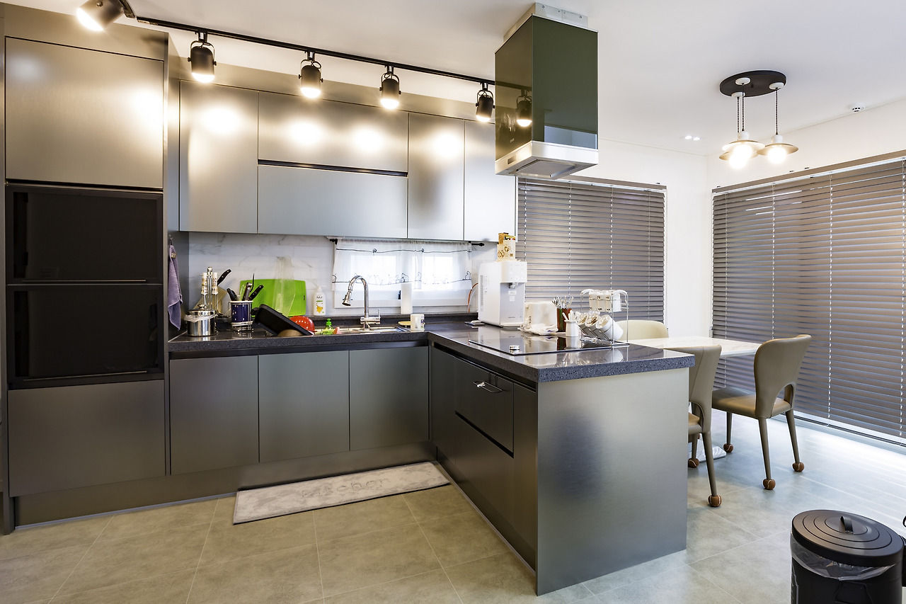 외관에서도 특별함이 느껴진 이 주택은 내부 또한 특별하게 시공되었습니다. 천정은 오픈천정으로 단층이지만 넓어보이면서 드라마틱한 느낌을 연출해줍니다. 또한 가족들이 함께 시간을 보내는 주방은 쉐프의 주방이 부럽지 않을 정도의 고급스러운 주방으로 탄생하였습니다.