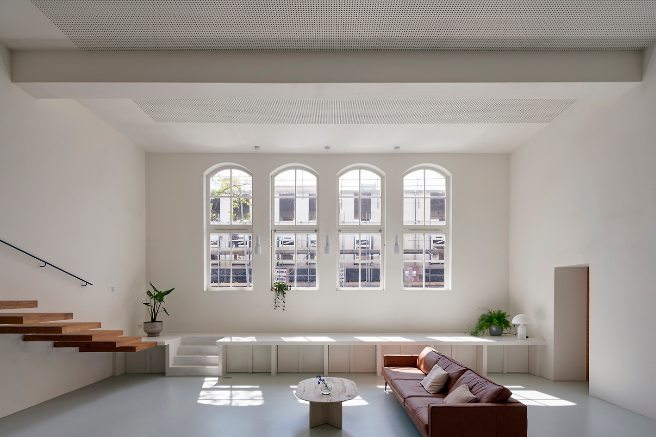 높은 천정과 유럽풍 느낌의 창문이 나란히 나열되어 있는 모습. 빈티지하면서도 감각적인 분위기를 연출해 주고 있습니다. 거실에는 작은 탁자와 소파 하나 뿐이 없는데도 말이죠. 해당 전원주택 인테리어는 높은 천정을 갖추고 있다는 점, 창문이 조금 윗 쪽에 있다는 점을 고려하여 스킵플로어 형태의 공간을 만들고, 그 공간은 2층으로 이어지게 시공하였습니다.