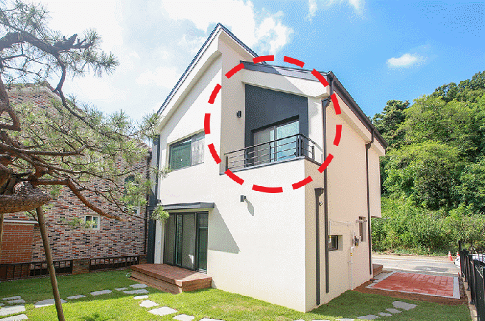 지금 보시는 주택의 2층에 있는 공간 또한 1층과 2층의 바닥면적 차이로 생겨난 베란다이겠지요. 하지만 유의해야 하실 것은 베란다의 경우에는 창호 설치가 불법이니 이 점은 꼭 알고 계셔야겠습니다.