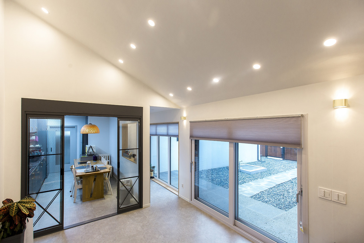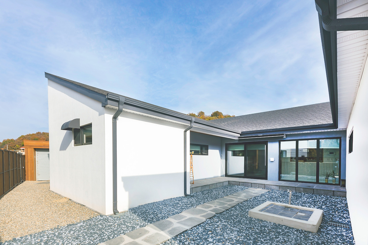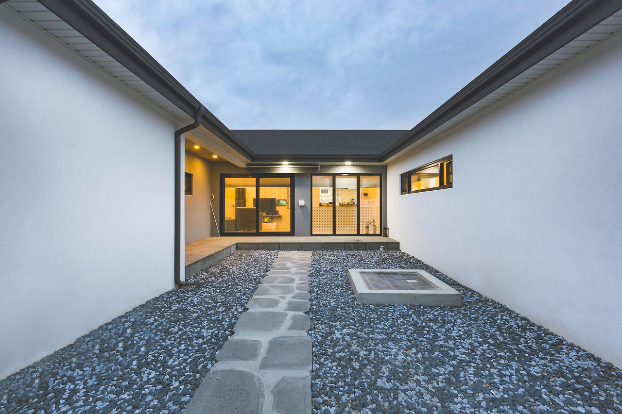 앞서 단층인데 어떻게 개인 프라이버시를 지킬 수 있는지 궁금해 하실 것 같다고 말씀드렸는데요, 프라이버시를 지킬 수 있는 그 이유는 바로 중정입니다 : ) 이 전원주택은 중정을 기준으로 좌, 우 부모님 세대, 젊은 부부세대로 나누어져 있어 개인의 프라이버시 보장이 가능합니다. 또한 중정은 프라이버시가 보장된다는 점 뿐만 아니라 가꿀 때 마다 다양한 매력을 보여주기 때문에 꾸미는 맛이 있는데요, 공간을 꾸미는걸 좋아하시는 분들이라면 나만의 작은 정원인 중정을 꾸며서 집안의 분위기를 바꿀 수도 있을 것 같습니다.