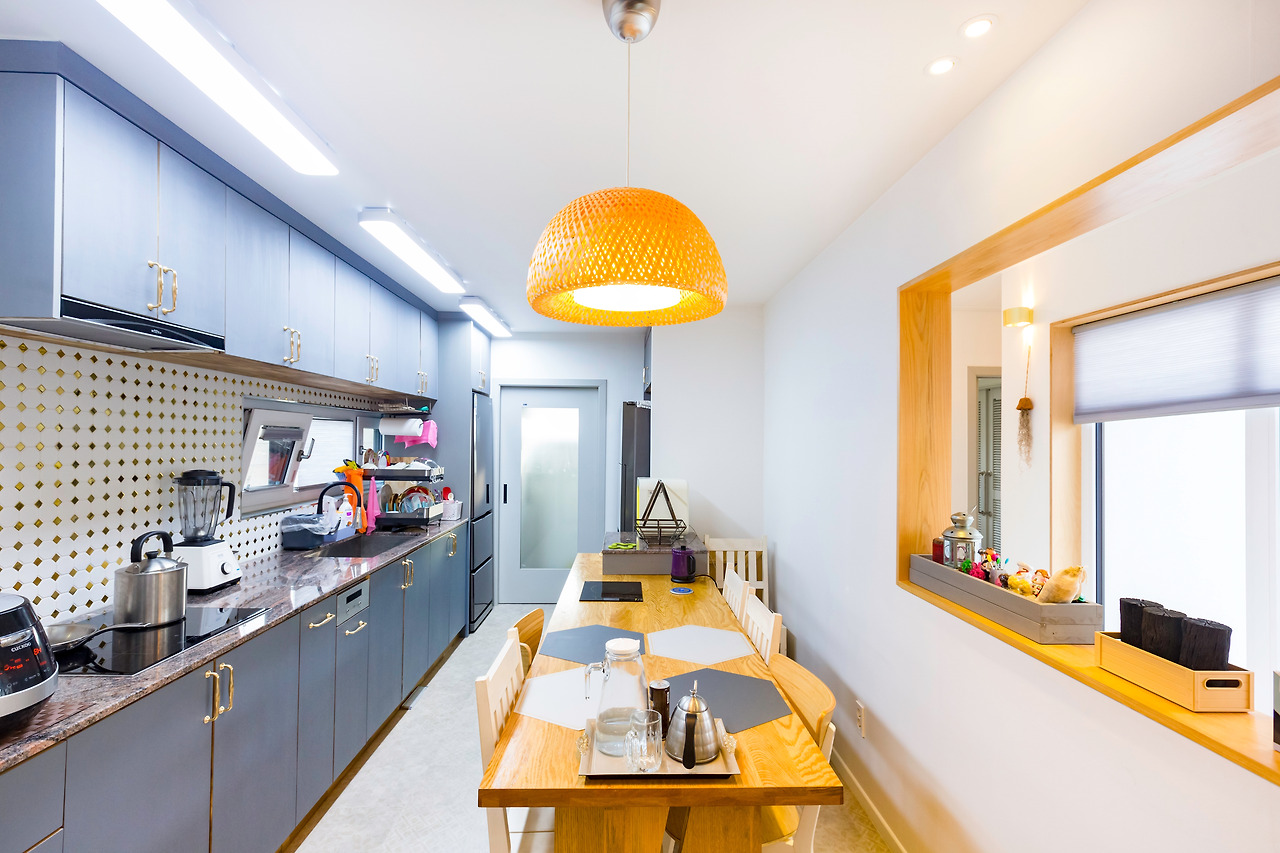 보통 거실이 주방보다 큰 공간을 차지하는 데 비해 이 집은 주방이 거실보다 더 크다고 하는데요, 그 이유는 건축주님의 가족분들이 주방에서 가장 많은 시간을 보내기 때문에 주방을 더 크게 하고 신경을 쓰셨다고 합니다. 주방에 크게 나 있는 창을 통해 요리를 하면서도 밖에 우리 아이가 놀고 있는 모습을 언제든지 볼 수 있을 것 같습니다.
