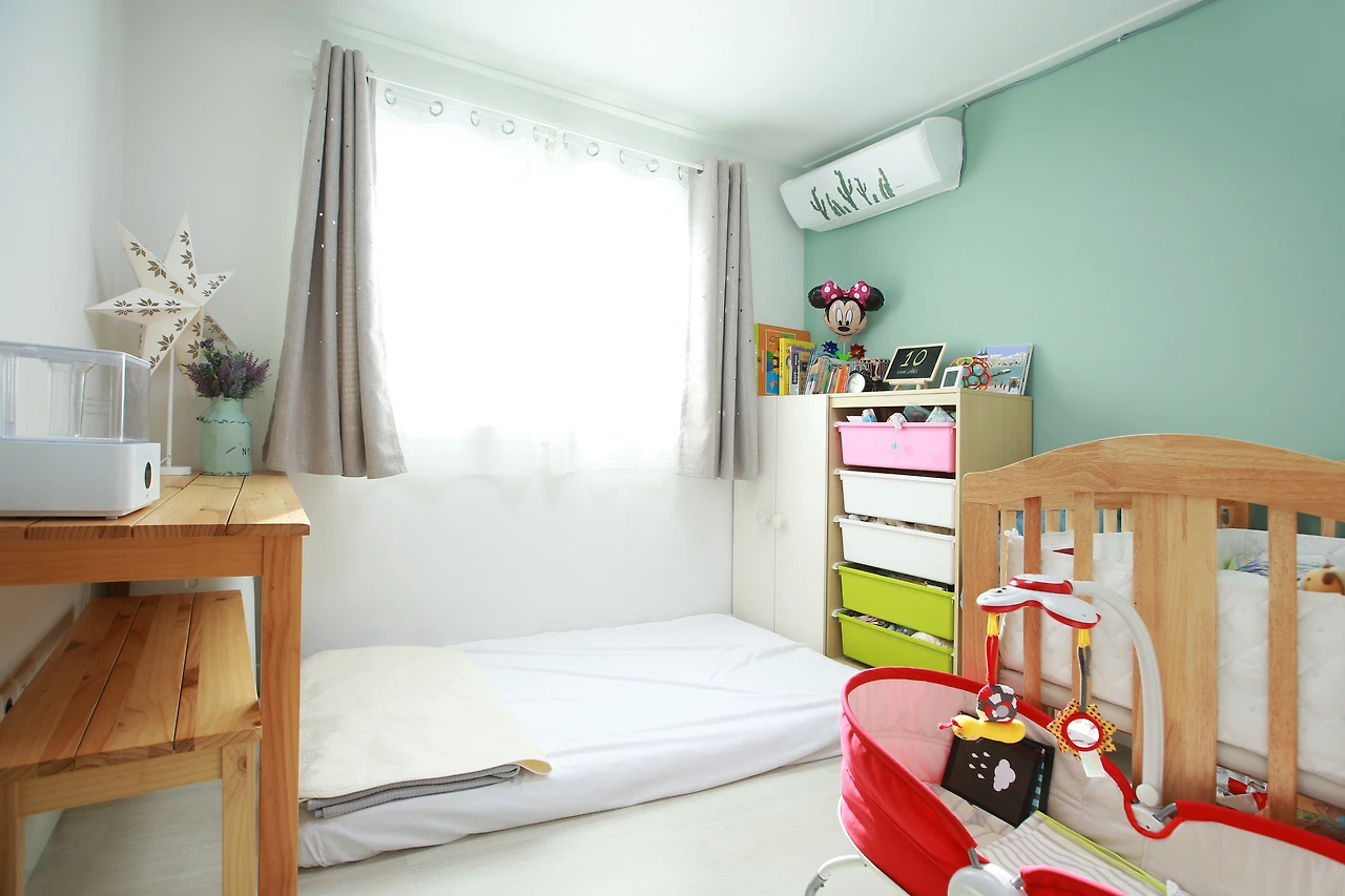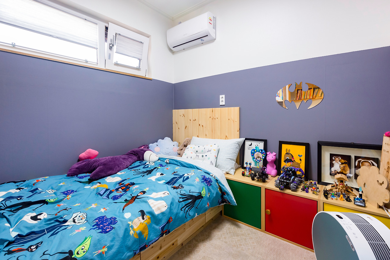 부부침실과 자녀침실 모습입니다. 부부의 침실은 깔끔한 느낌으로, 자녀의 방은 알록달록한 느낌으로 활기찬 기운을 가져다 줍니다.