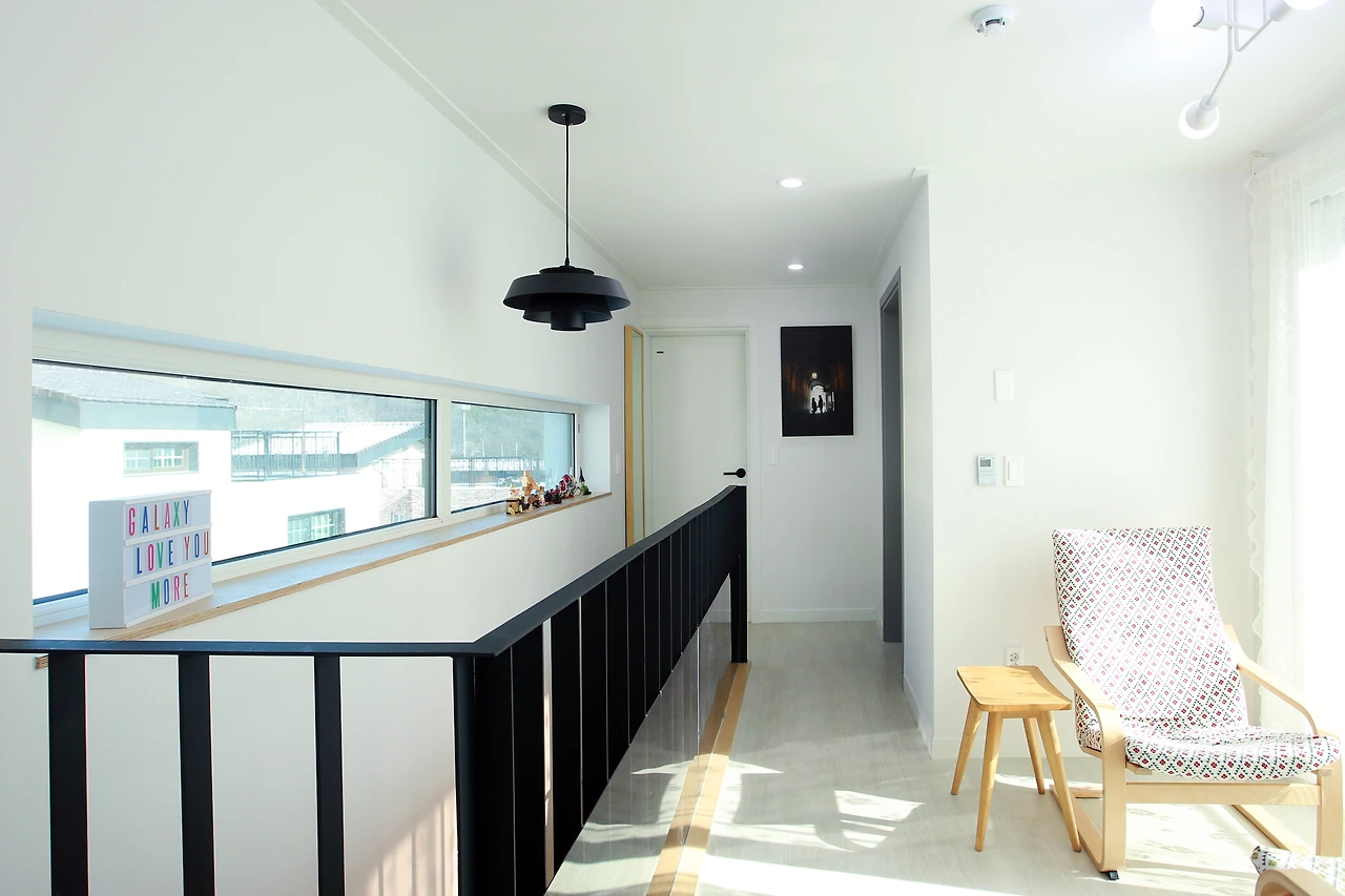 2층에는 온전히 가족들이 모여서 쉴 수 있도록 하기 위해 방을 따로 두지 않고 거실과 주방만을 두어 오직 가족 공용공간으로만 구성을 하였습니다. 전체적으로 큰 창을 두어 따사로운 햇살이 자연스럽게 들어올 수 있도록 하였으며, 작은 베란다가 자리하고 있어 공기순환에도 굉장히 도움이 될 것 같습니다. 인테리어는 벽지와 가구들은 모두 화이트톤으로 통일하여 호불호가 갈리지 않으며 군더더기 없이 깔끔한 느낌을 줍니다.