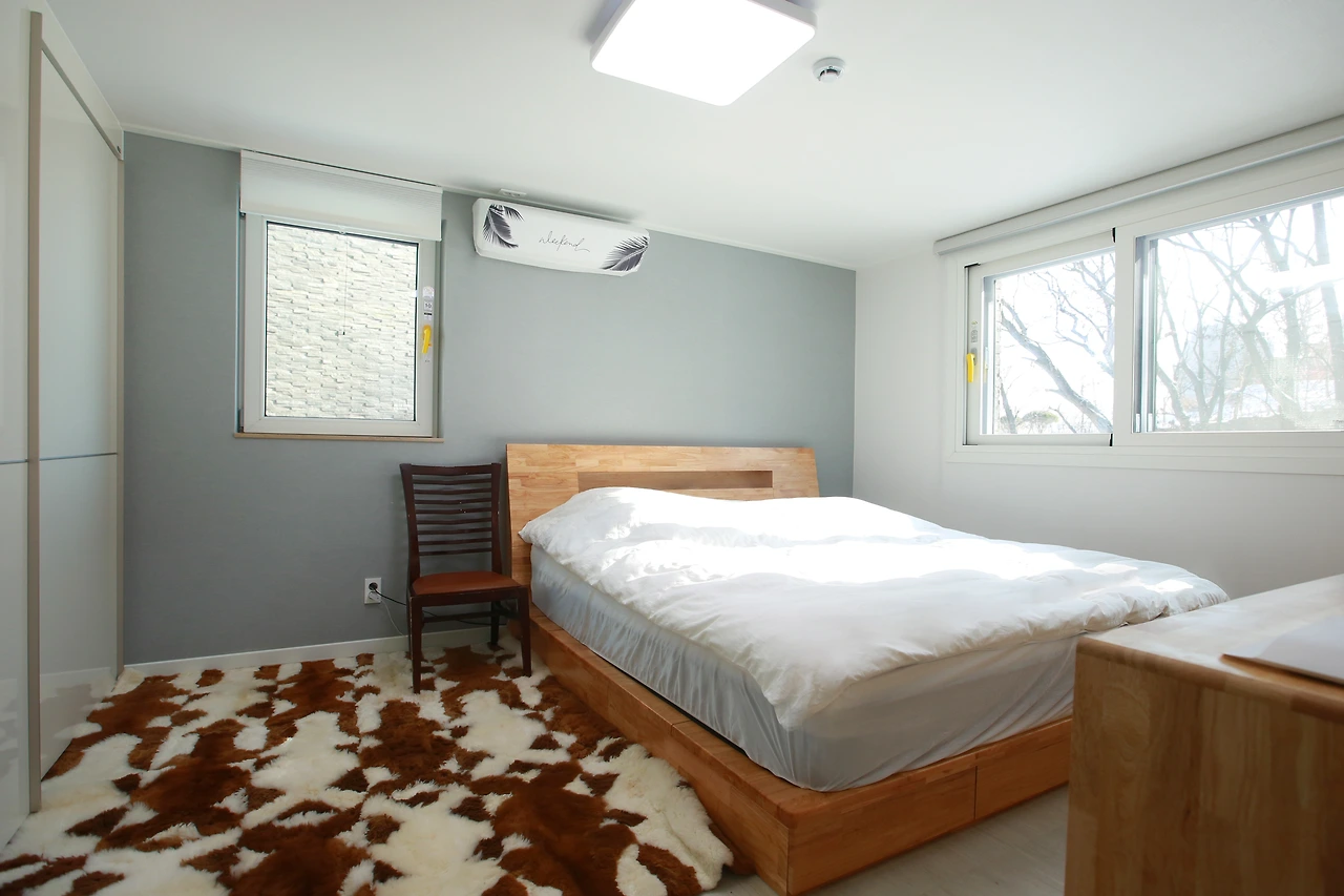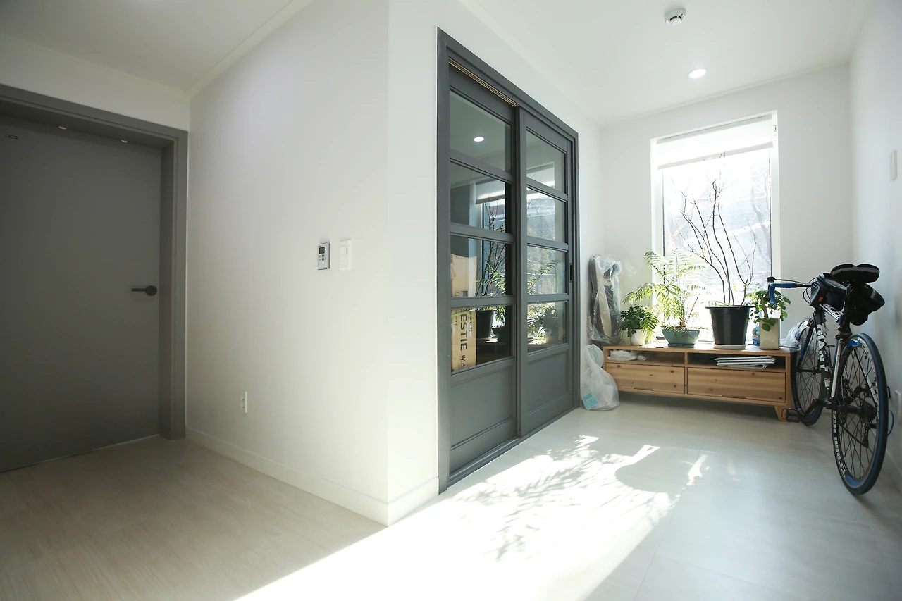 이 주택은 입구에서부터 따스한 느낌이 감도는 인테리어와 마주하게 됩니다. 1층은 건축주님의 부모님을 위한 공간으로 침실과 화장실만을 두어 부모님이 지낼 수 있도록 하였는데요, 아무래도 부모님께서 연로하시기 때문에 계단을 많이 올라가야 하는 2층이나 3층이 아니라 1층으로 부모님 세대의 공간을 구성하여 편안하게 지낼 수 있도록 한 건축주님의 배려가 돋보이는 공간입니다.