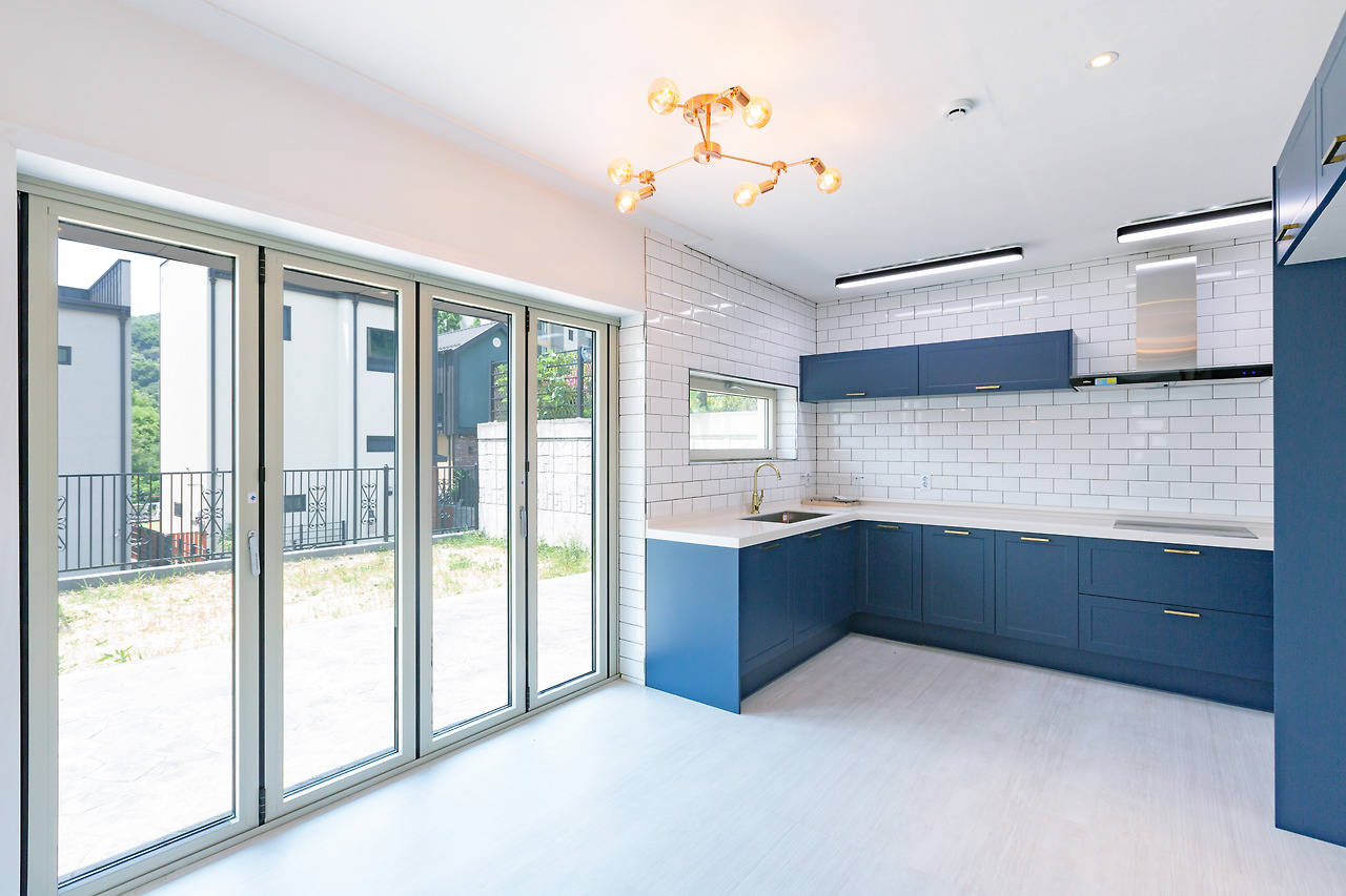 1층은 가족 공용공간으로 구성되어 있으며, 현관을 중심으로 거실/주방이 분리된 형태로 시공되었습니다. 또한 거실과 주방 모두 마당과 연결되어 있는 큰 도어가 있어 마당-내부와의 소통이 잘 되며, 집 내부에서도 답답한 느낌이 들지 않고 탁 트인 느낌을 받을 수 있겠습니다.