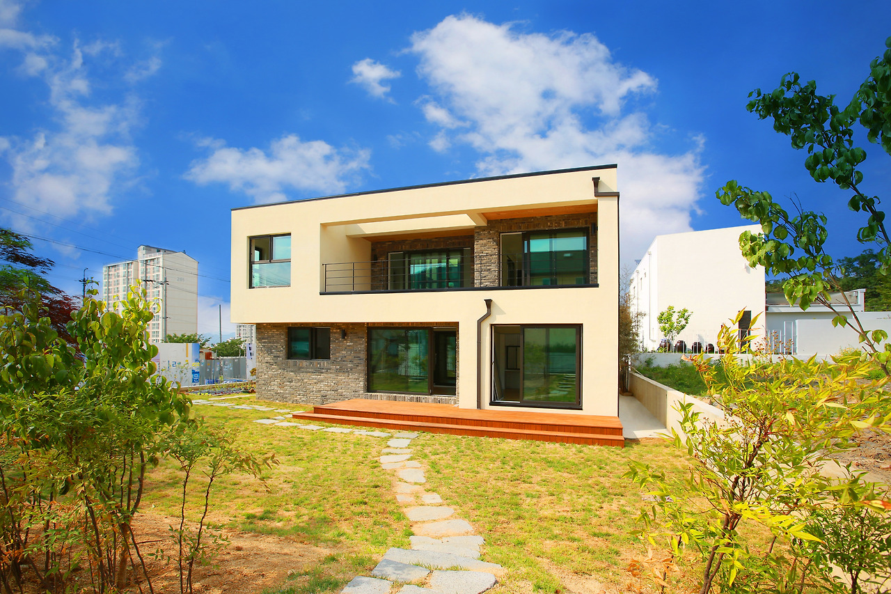 57평대 2층 규모로 시공된 콘크리트주택입니다. 주택의 정면과 배면의 느낌이 사뭇 다른데요, 정면은 현대적이면서도 사람들이 다니는 도로 면에서는 우리 가족들의 프라이버시가 노출도지 않도록 창을 많이 두지 않았습니다. 반면에 배면을 보시면 해가 드는 쪽으로 창이 굉장히 많이 들어서 있는 것을 보실 수 있지요. 1층 내부와 외부를 연결시켜주는 창호는 물론이며, 2층에는 하늘을 볼 수 있는 테라스가 자리하고 있습니다.