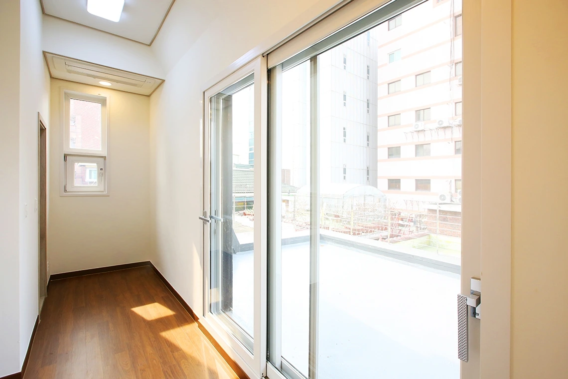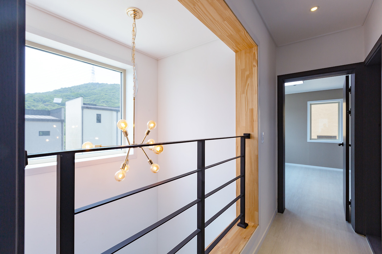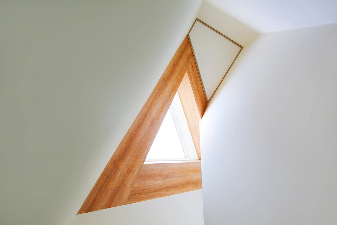 그리고 4층은 서울 도심을 한 눈에 담아낼 수 있는 옥탑이 자리하고 있습니다. 빽빽한 도심이지만 뻥 뚫린 전경을 집 안에서도 느낄 수 있다는 장점이 있지요! 그리고 집 외관에서 볼 수 있었던 삼각형 창문은 알고보니 4층 옥탑층 곳곳에 햇살을 내려주는 창호가 자리하고 있습니다.