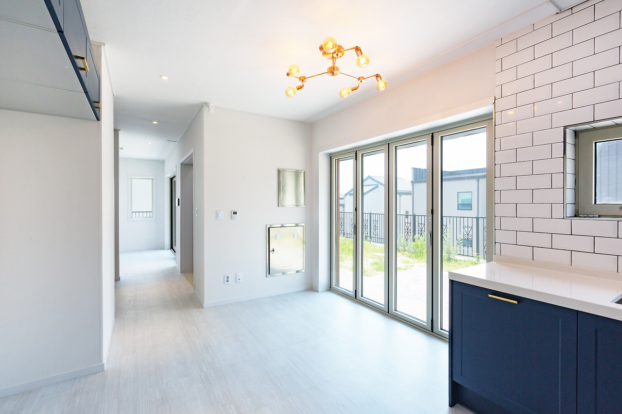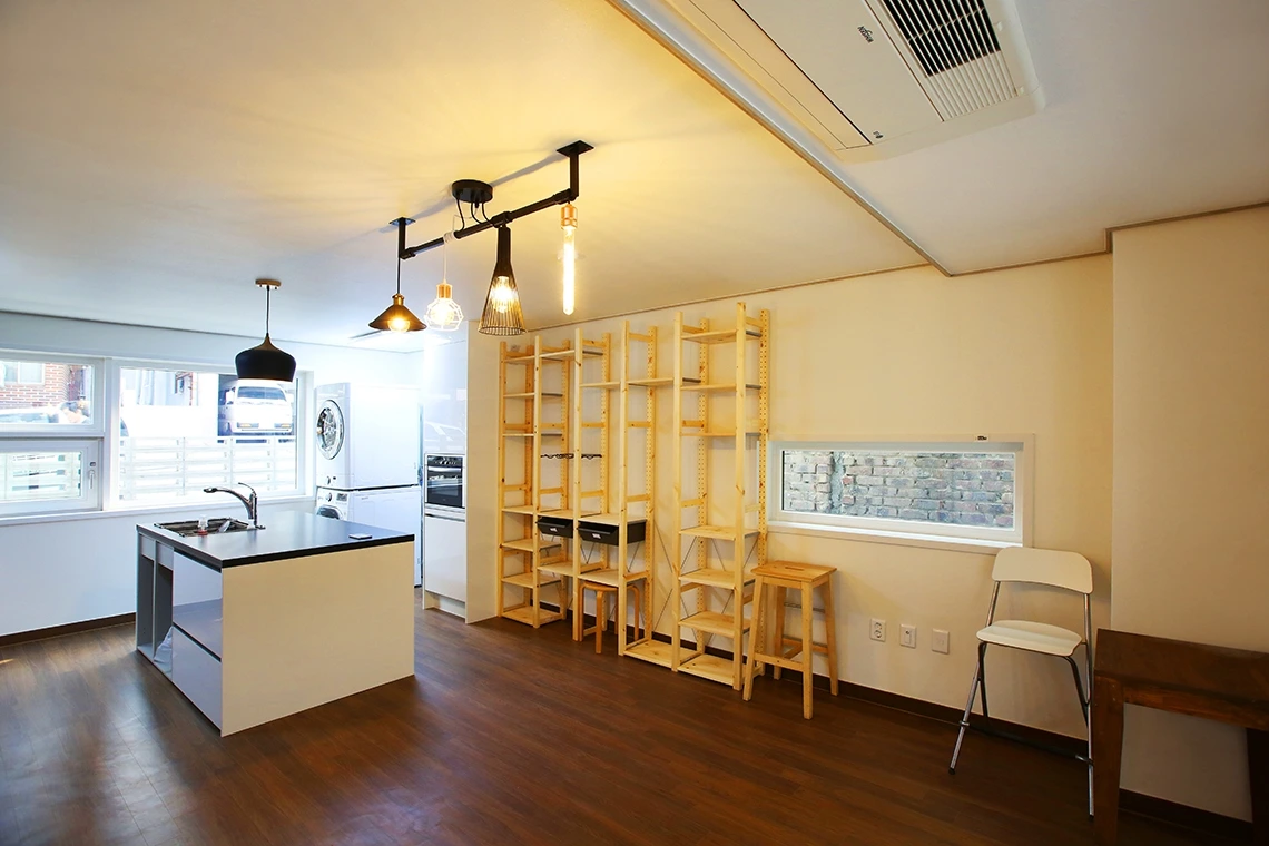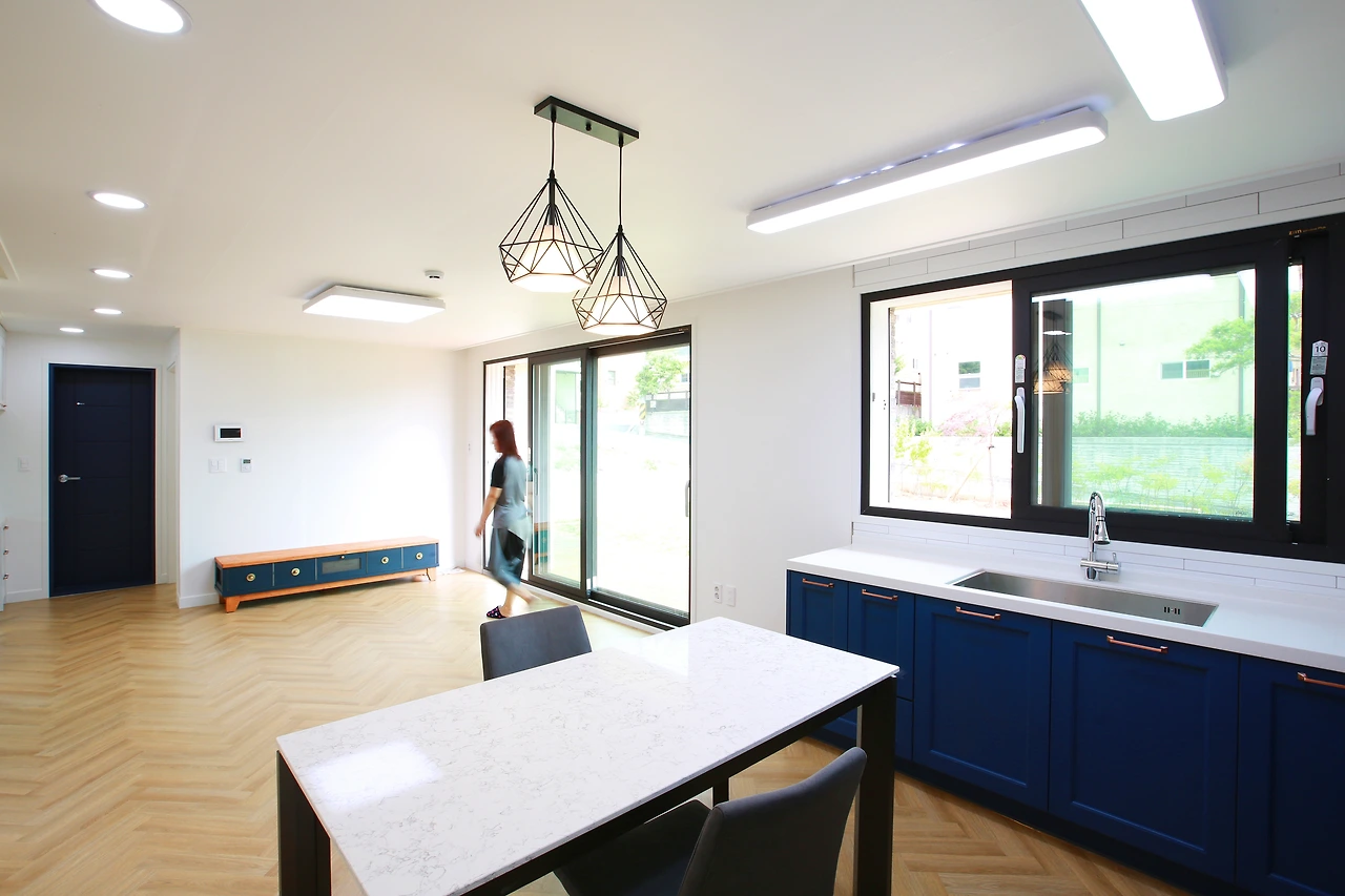 가족 공용공간인 주방겸 거실입니다. 카페테리아의 모습처럼 보여지는 이 공간에서 가족들과의 식사는 물론이며 오붓한 시간을 가질 수 있도록 하였습니다.