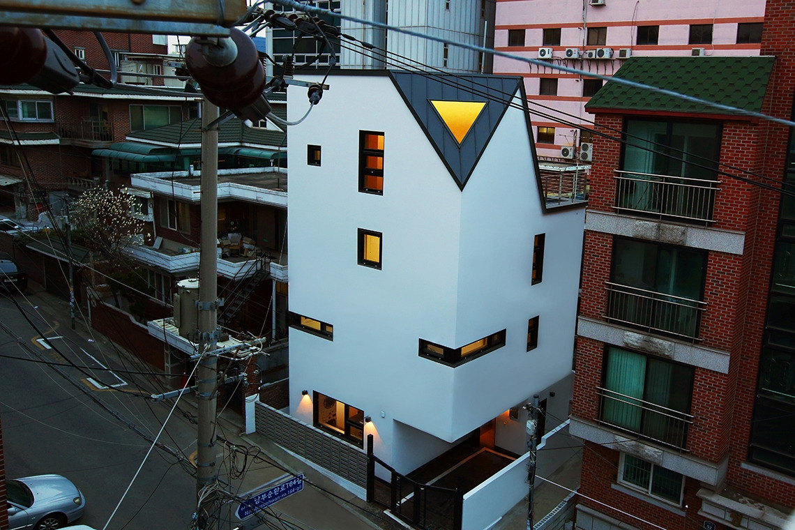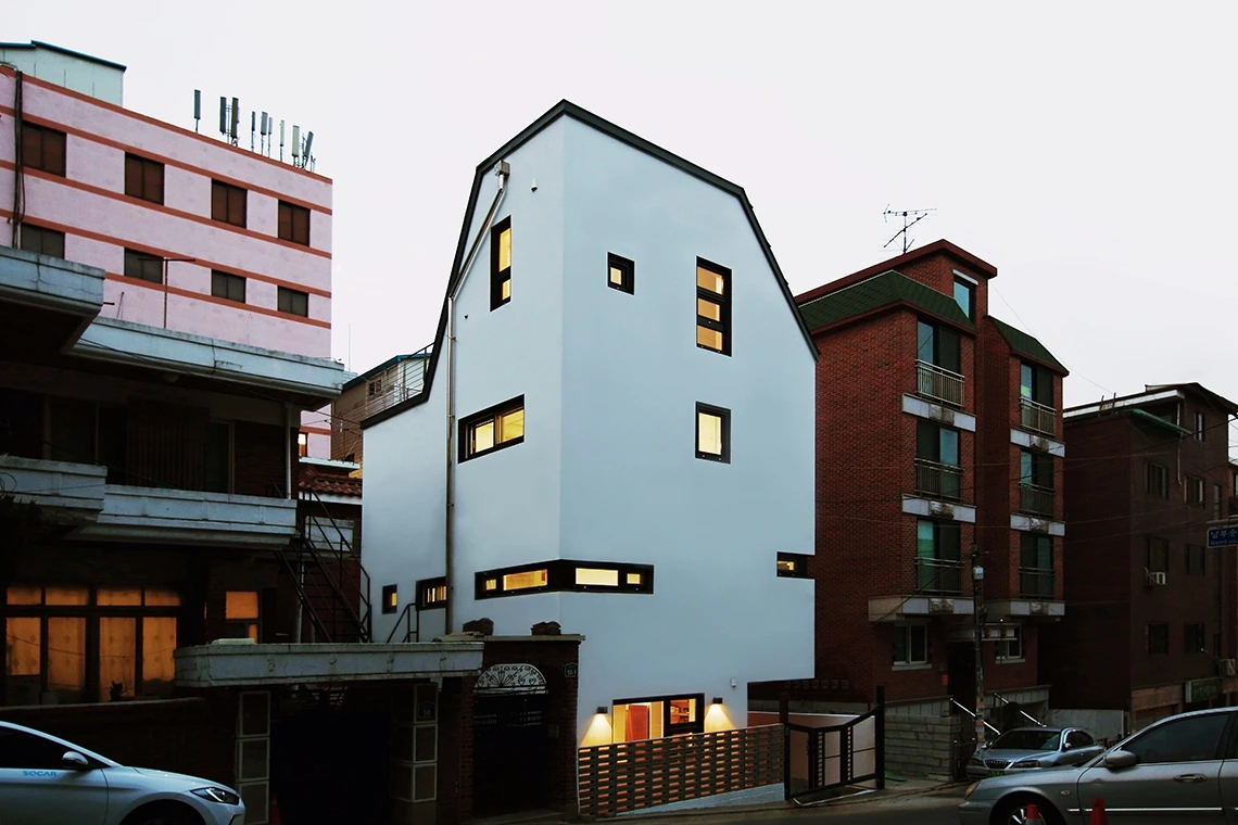 이 주택은 지상 1층 ~ 지상 4층으로 구성된 주택입니다. 외관은 하얀 스타코플렉스로 시공하였으며, 작은 창문과 맨 꼭대기의 삼각 창문에서 아늑한 조명이 비추는 모습입니다. 총 평수는 41평대로 3대가 거주하는 주택이라고 하는데요, 4층규모에 40평대로 구성된 주택이라면 눈치채셨겠지만 층마다 작은 공간들로 구성되어 있습니다. 하지만 설계에 따라 공간 구성을 잘만 해준다면 지금 보시는 단독주택처럼 3대가 거주하여도 손색없겠지요.