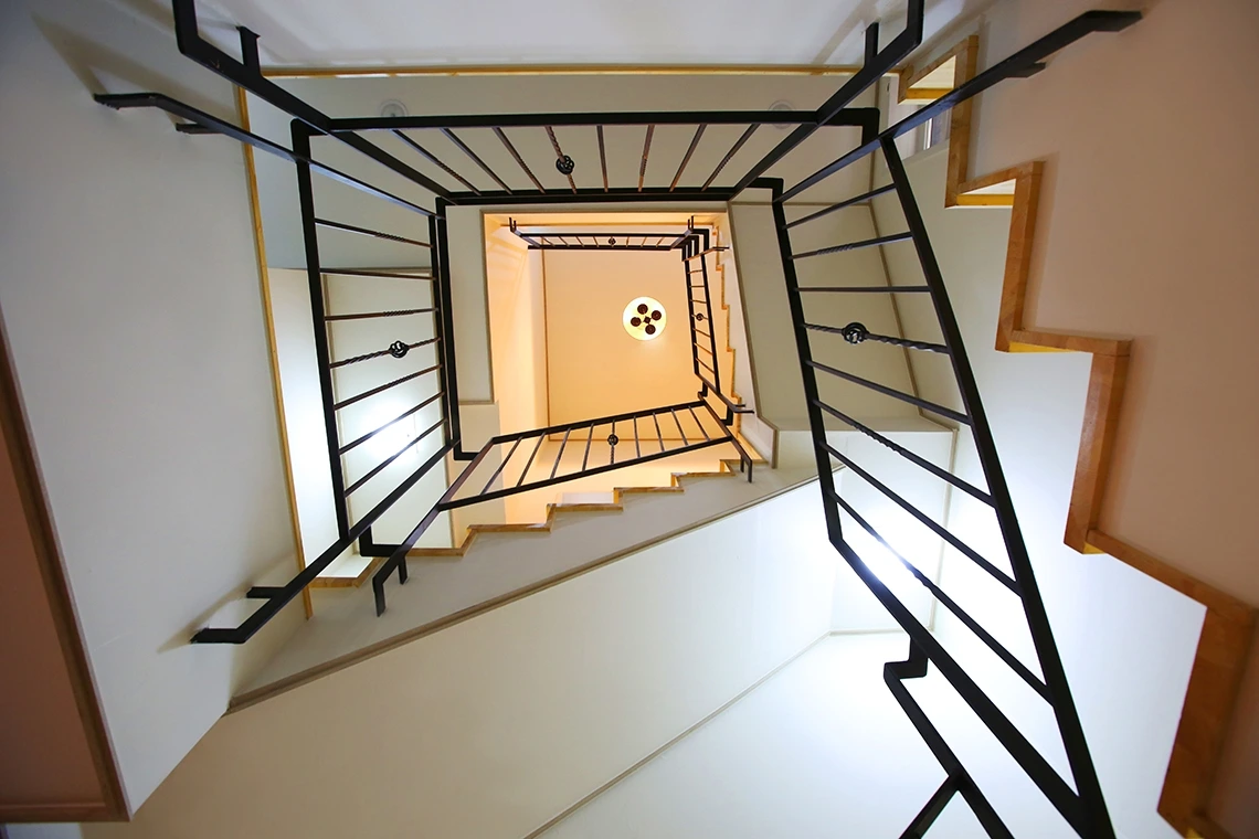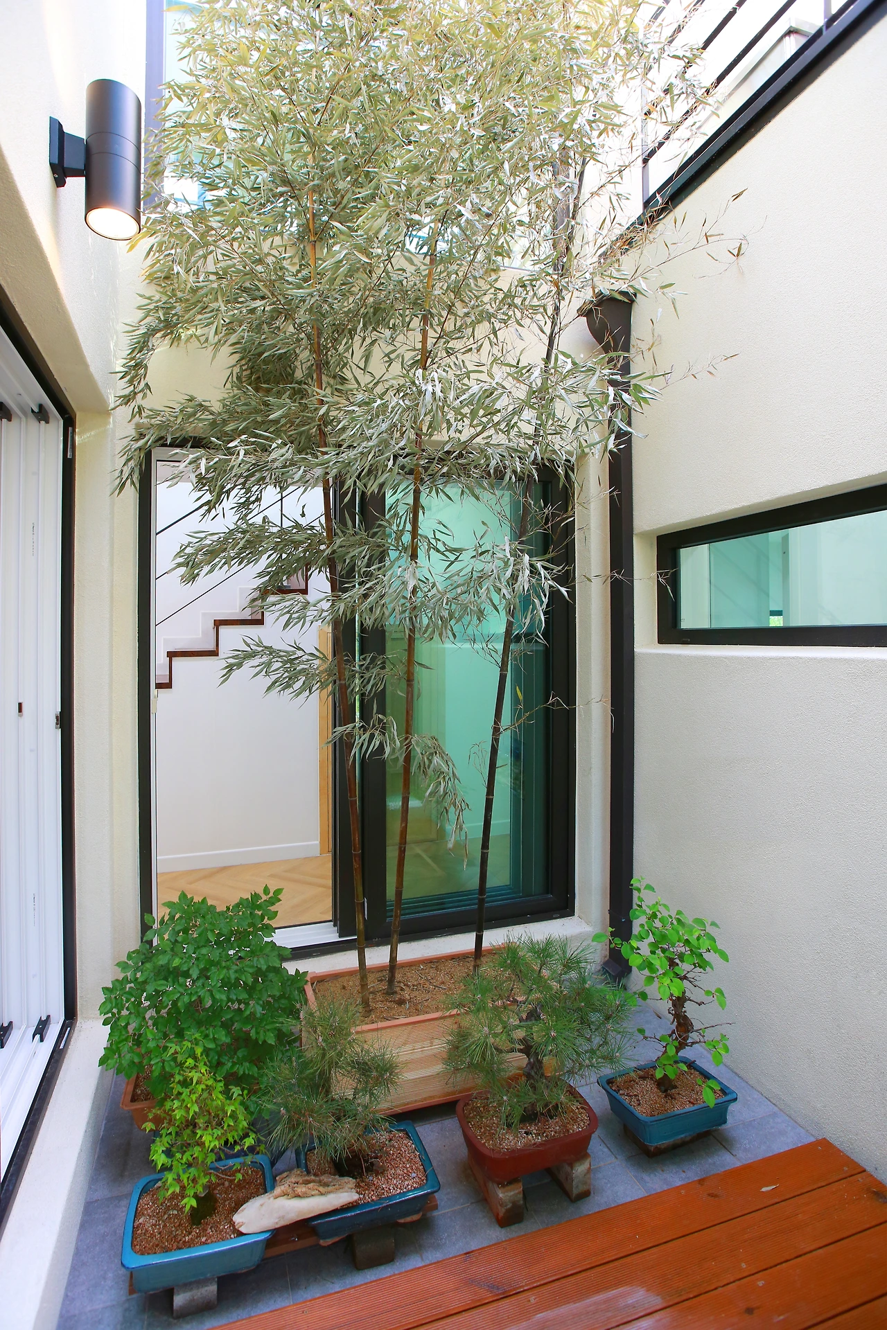 해당 주택은 들어서면 계단, 복도가 있으며 복도 끝에 다 가기 전에 중정을 만날 수 있습니다. 이 주택은 건축주님의 개인생활공간과 학생들이 찾아오는 작업실로 나누어야 했는데요, 건축주님께서 이 두 공간이 서로 독립되길 원하셨기 때문에 개인 집에 중정을 두어 프라이버시를 지키도록 하였습니다.