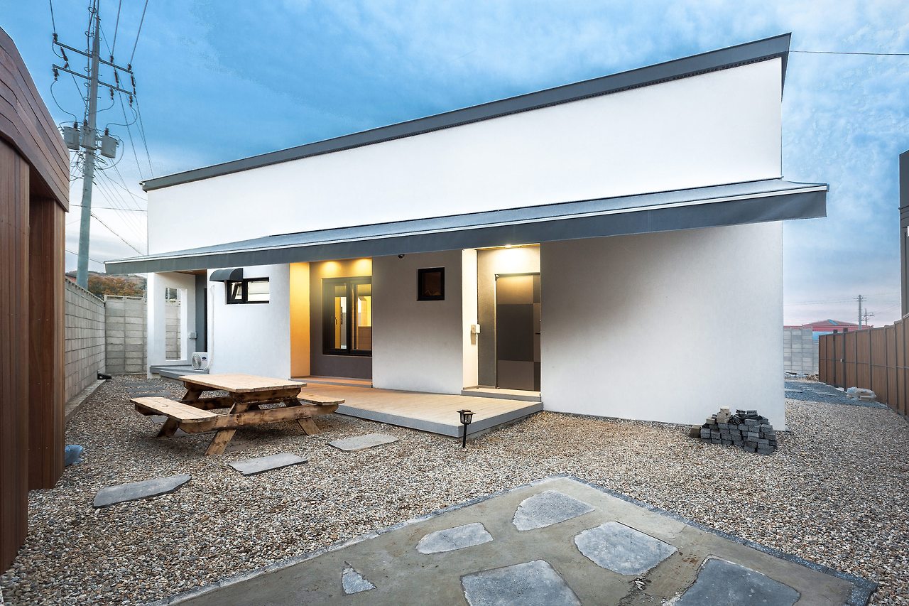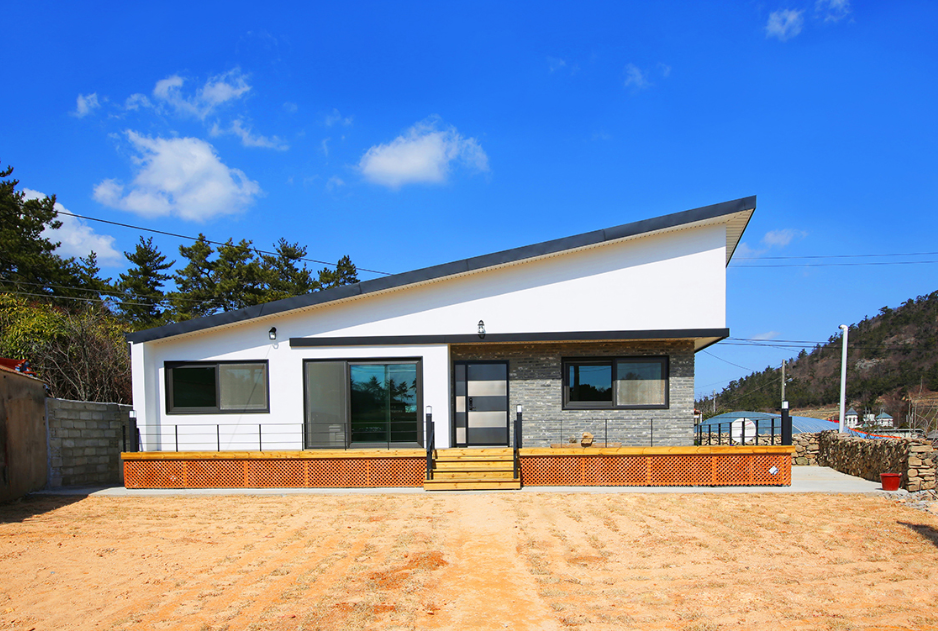지붕 경사가 한 쪽으로 흐르면 양 쪽 경사가 생기는 박공 지붕에 비해 큰 하중이 부담되고 지붕 부재 하나의 길이가 길어지는 단점이 있습니다. 하지만 건물 규모를 고려해 적절한 경사도의 지붕을 계획한다면 환기나 방수 등의 하자 없이 단순하고 멋스러운 형태를 연출할 수 있습니다. 이 또한 눈과 비가 자연스럽게 흘러 내리는 형태이기 때문에 목조주택에 적합한 지붕입니다.