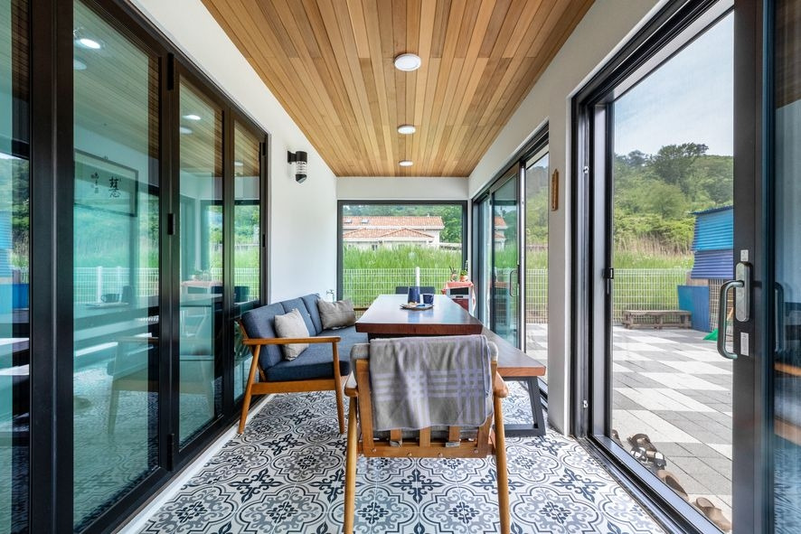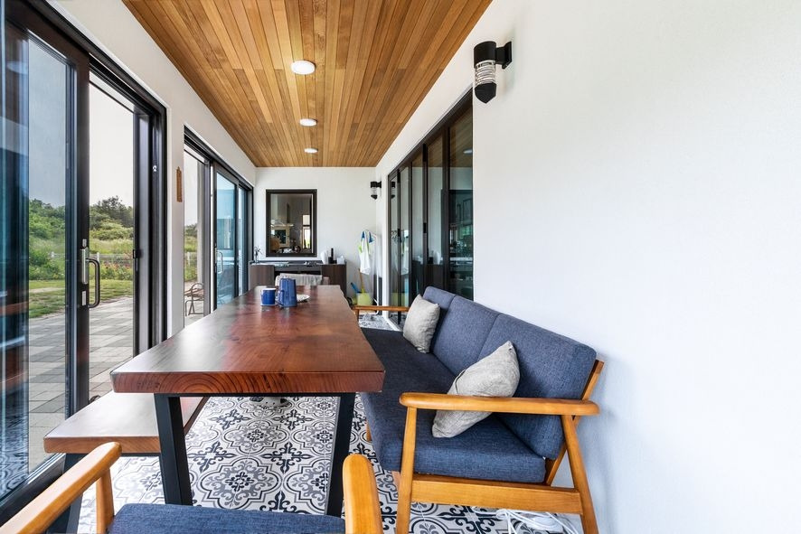 주택 내부와 외부를 연결해주는 이 테라스 공간은 우리나라 한옥의 공간에서 영감을 얻은 '봉당'느낌의 공간입니다. 테라스의 역할도 하지만 실내이기 때문에 식사공간 티타임 공간으로도 얼마든지 활용이 가능하겠습니다. 이 공간은 폴딩도어로 시공하여 집 내부와 연결성을 또 한번 고려한 것이 느껴집니다.