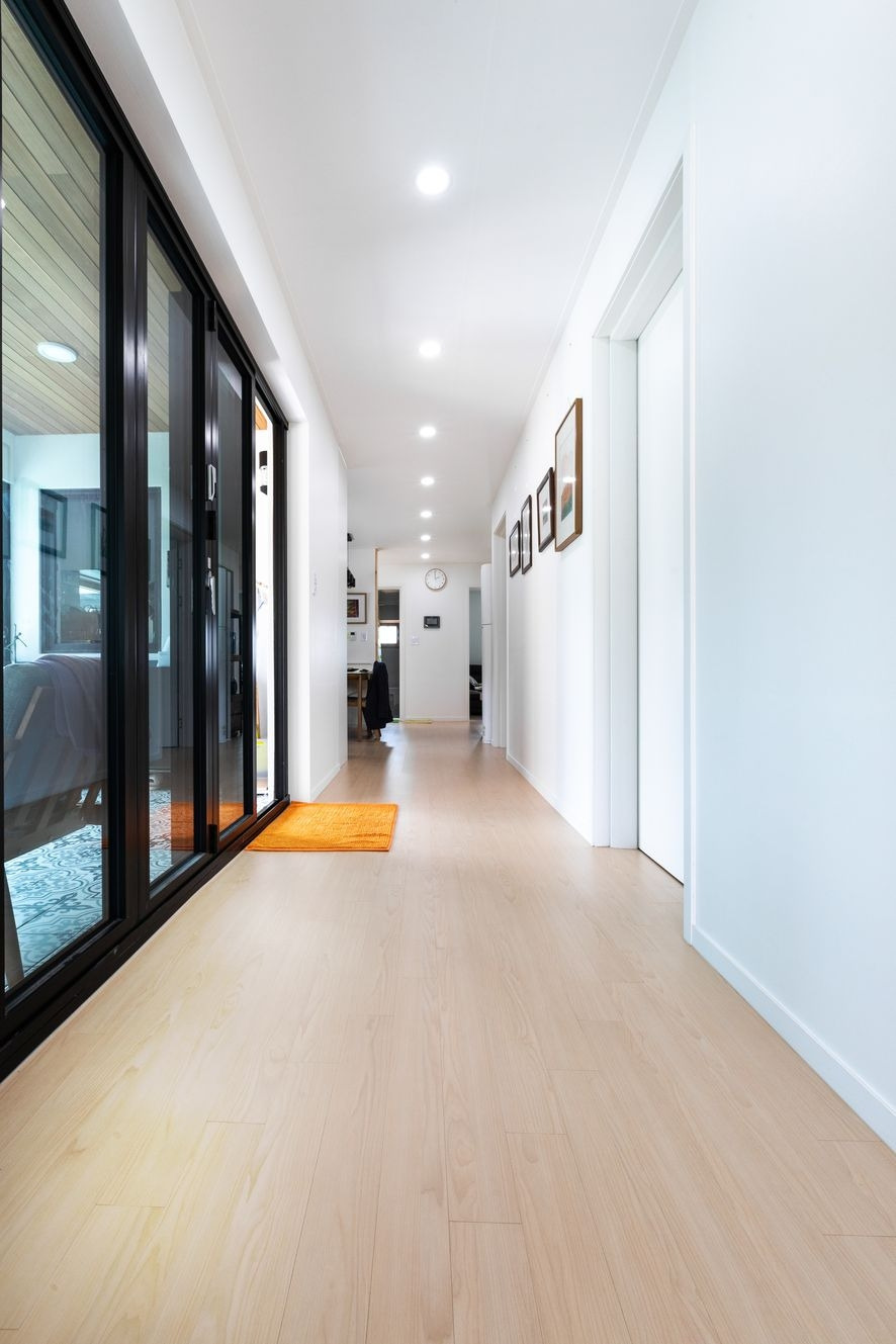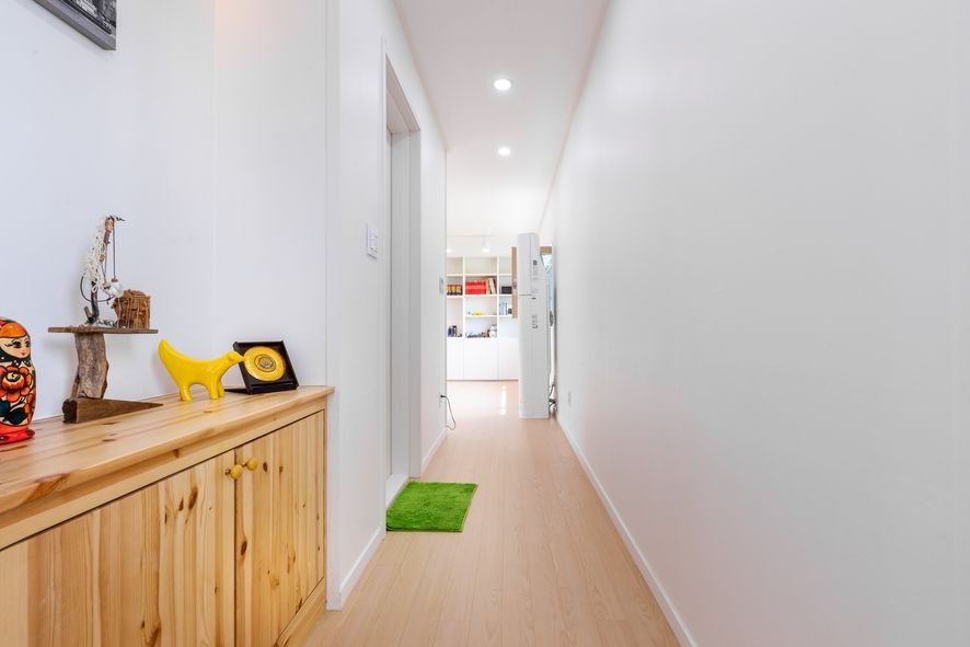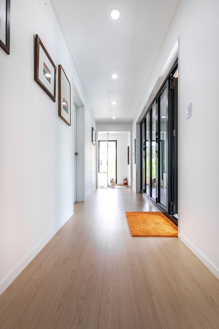 현관을 들어서면 보여지는 복도의모습입니다. 현관에 들어서자마자 우측에는 욕실, 침실 2개가 있으며, 앞 마당과 집을 연결해주는 공간이 있는데요, 이 집의 특징이자 굉장히 특별한 공간이라고 할 수 있습니다. 외부 날씨에 영향을 받지 않는다는 큰 장점이 있으며, 이를 통해 외부의 밝은 빛이 복도를 밝혀주는 것은 물론이며, 공기의 순환이 원활할 수 있도록 해줍니다.