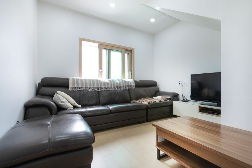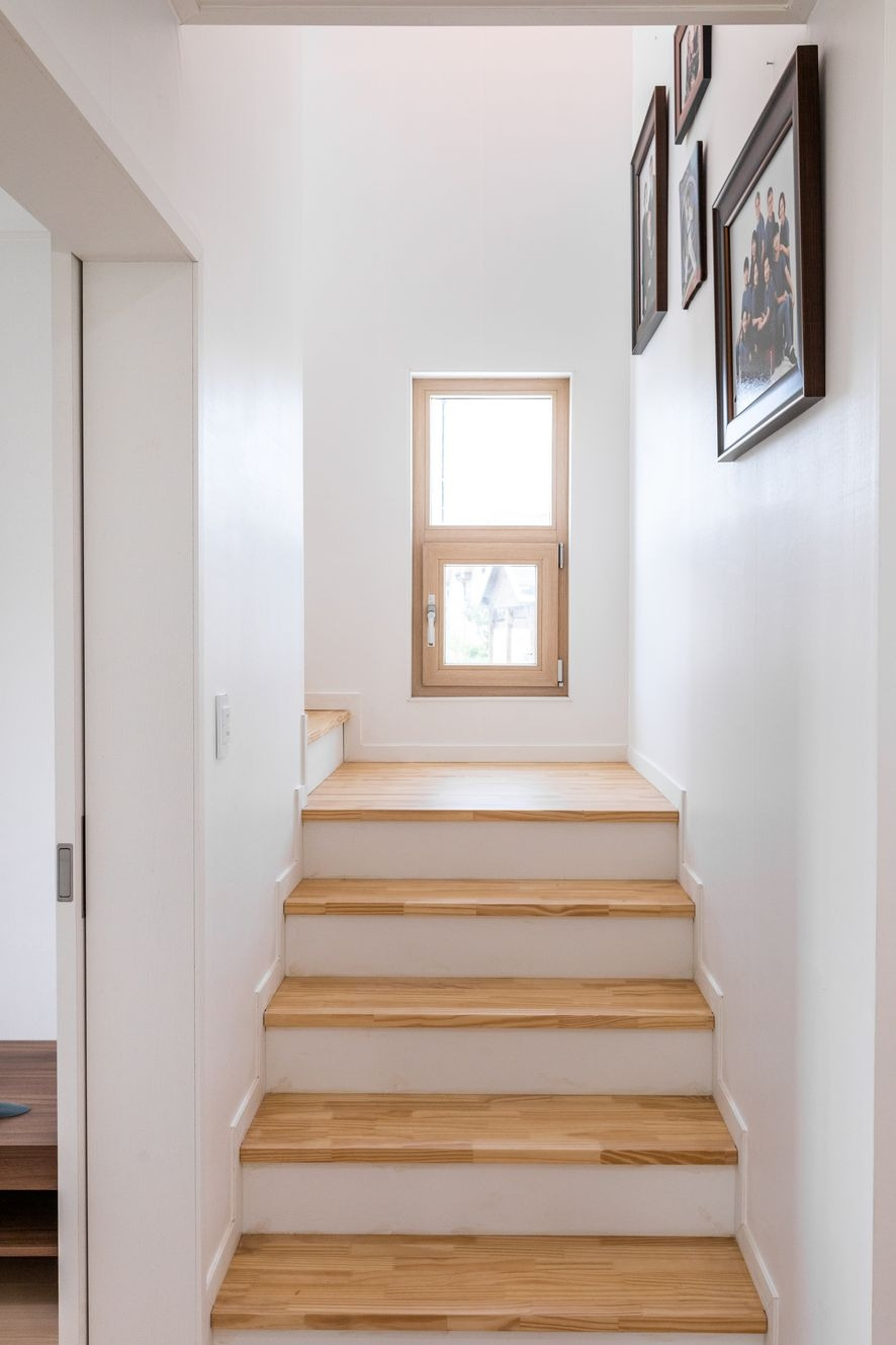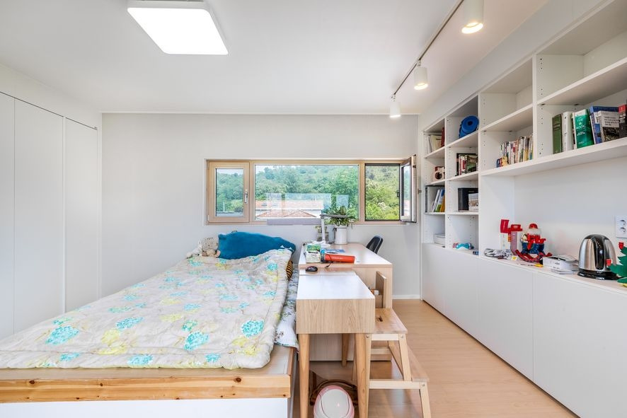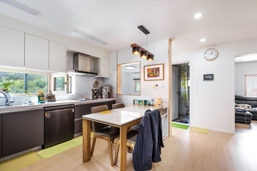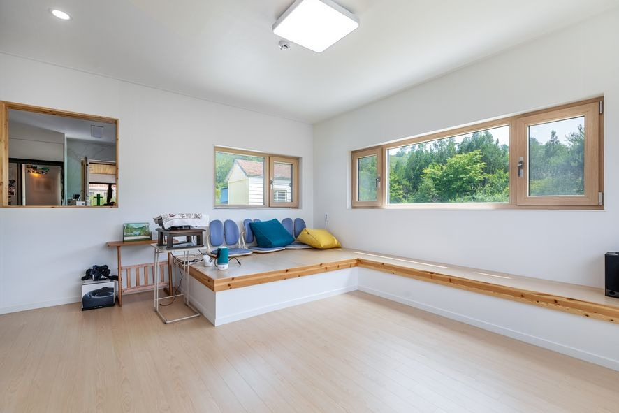 주방과 분리가 되어 별도의 거실로 보여지지만, 가벽에 창을 내어 소통을 원활하게 할 수 있는 이 거실에는 툇마루를 연상하게 만드는 공간이 있어 가족들과의 화목한 시간을 보낼 수 있을 것 같습니다. 다른 주택에서는 찾아볼 수 없는 것으로 건축주님의 뚜렷한 개성과 이 집의 특징이 잘 보여지지요. 이 외에도 벽면에는 수납을 할 수있는 가구를 시공하였으며, 화이트&우드톤의 조합으로 밝고 네추럴한 느낌을 느낄 수 있습니다.