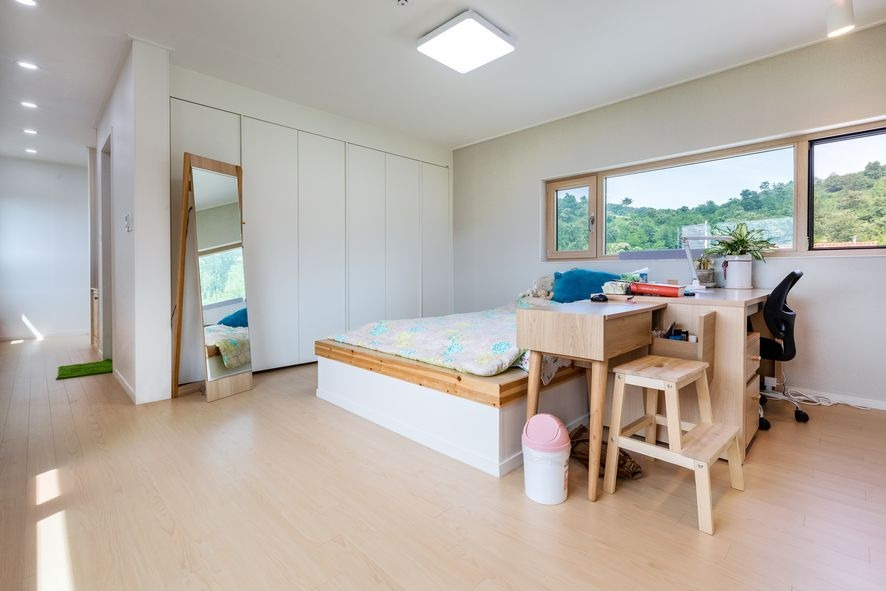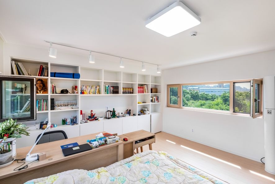 건축주님의 작업실은 창문이 바라보는 형태로 자리하고 있어 바람이 불면 서로 맞바람칠 수 있도록 하여 공기순환에 원활하고 햇살도 잘 들어와 항상 밝은 공간이 유지될 수 있도록 하였습니다. 천정의 조명 또한 LED 천정 조명과, 작업에 몰두할 수 있도록 레일 조명을 달았는데요, 벽지와 동일한 화이트컬러로 시공하여 센스있는 침실, 작업실로 완성되었습니다.