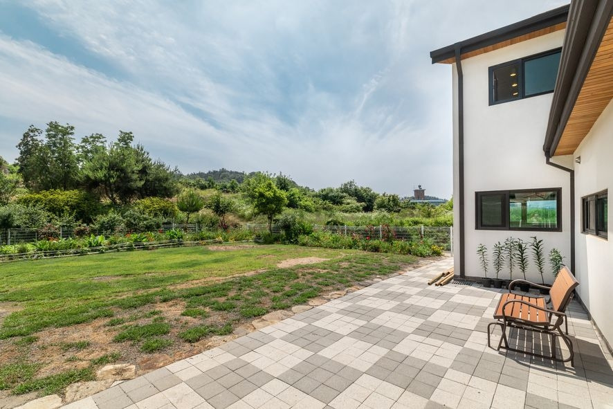 세련된 느낌 보다는 포근하면서 편안한 모습을 보여주는 이 목조주택은 40평대로 시공된 2층집입니다. 외장재는 하얀 스타코플렉스로 시공하였으며, 주택의 하부는 벽돌로 마감하여 클래식한 느낌을 줍니다. 'ㄱ'형태로 시공된 이 주택 앞으로는 직사광선 보다는 어느정도 그늘이 질 수 있어 편안하게 휴식을 취할 수 있겠습니다.