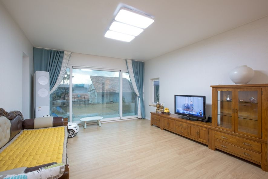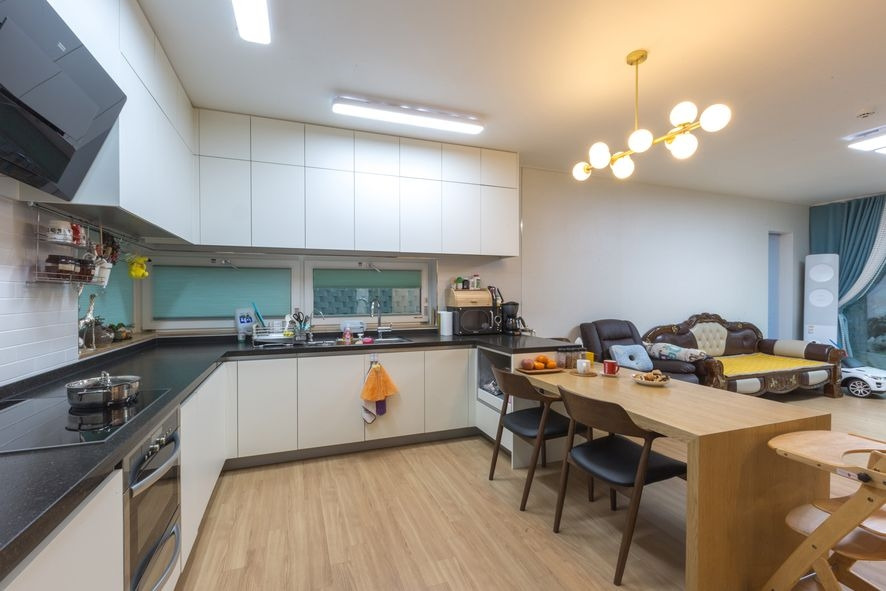 주방과 거실은 동선이 짧은 형태로 시공하여 공간을 최대한 효율적으로 사용할 수 있도록 하였습니다. 또한 거실에 큰 창을내어 외부마당과의 소통이 원활하며, 이 창을 통해서 들어오는 채광이 거실은 물론이며 주방까지도 밝게 비춥니다.