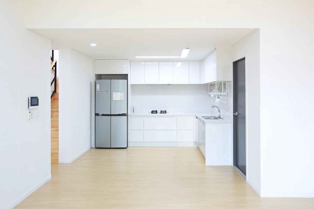 1층은 마당-거실-주방의 동선이 연결되어 소통이 원활할 수 있도록 하였습니다. 주택의 내부는 깔끔한 화이트톤 벽지와 밝은 우드톤으의 바닥재로 마감하여 깔끔하고 네츄럴하게 시공되었습니다.